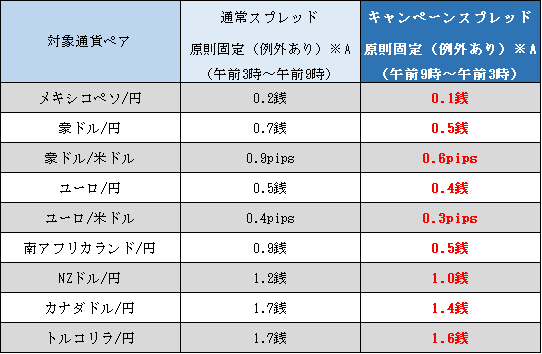 ※キャンペーンスプレッドの提示時間帯はすべて対象期間中の各営業日の午前9時~翌午前3時。同期間中の通常スプレッドは各営業日の午前3時~午前9時に提示。