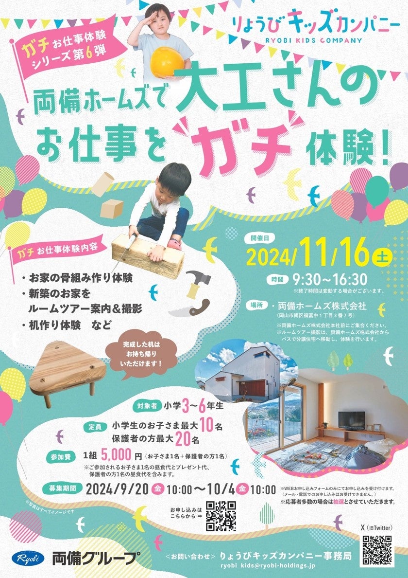 両備グループ(事務局:岡山県岡山市北区下石井二丁目10番12号 杜の街グレース オフィススクエア5階、グループ代表兼CEO:小嶋光信)は、2024年11月16日(土)に、小学生のお子様向けのお仕事体験イベント“ガチ”お仕事体験シリーズ第6弾~両備ホームズで大工さんのお仕事を“ガチ”体験~を開催することになり、10月4日(金) まで参加者を募集しますので、お知らせします。