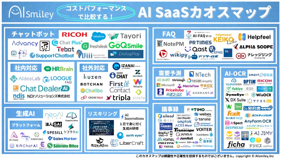 特に「費用が安いAIを探している」「スモールスタートからAI活用をはじめたい」といった企業様におすすめの、サービスのジャンルごとに俯瞰できるカオスマップとなっております。