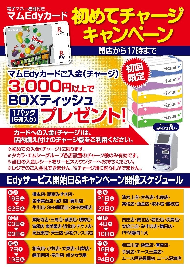 キャンペーン内容 | キャンペーン期間中に、以下の条件を達成した方に、BOXティッシュ(5P)を進呈します。 【条件1】 店内設置のチャージ機にて「マムEdy-楽天ポイントカード」に3,000円以上チャージ 【条件2】 チャージレシートを持参し、景品と引き換え ※「初めて」のチャージのみ対象となります。 ※キャンペーンはエリア毎に段階的に実施します。 【第1弾】 エリア:神奈川・愛知8店舗 期間:9月16日(土)~9月22日(金) 対象店舗:湘南みずき、橋本、堀川、四季美台、豊川、牛川、豊明、東郷 【第2弾】 エリア:静岡西部11店舗 期間:9月23日(土)~9月29日(金) 対象店舗:テクノ、浜北、東美薗、天王、高丘東、三島、フレスポ、富塚、篠原、蜆塚、頭陀寺 【第3弾】 エリア:静岡中遠7店舗 期間:10月7日(土)~10月13日(金) 対象店舗:大東、山梨、相良、小笠、磐田南、竜洋、超タカラ屋 【第4弾】 エリア:静岡中部A7店舗 期間:10月21日(土)~10月27日(金) 対象店舗:若松、城北、羽鳥、古庄、清水上、藤枝、安倍口 【第5弾】 エリア:静岡中部B8店舗 期間:11月4日(土)~11月10日(金) 対象店舗:高松、坂本、大谷、小鹿、鎌田、みずほ、曲金、静岡1st 【第6弾】 エリア:静岡東部7店舗 期間:11月18日(土)~11月24日(金) 対象店舗:柿田川、桃里、厚原、今泉、A伊豆長岡、A沼津、A三島 |