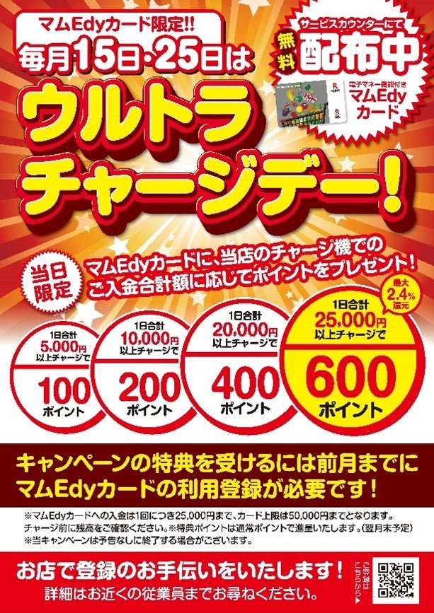 注意事項 | ※本キャンペーンは「マムEdy-楽天ポイントカード」のみ進呈対象となります。 ※本キャンペーンにおけるチャージは対象店舗の店内設置チャージ機でチャージされた場合のみ対象となります。 |