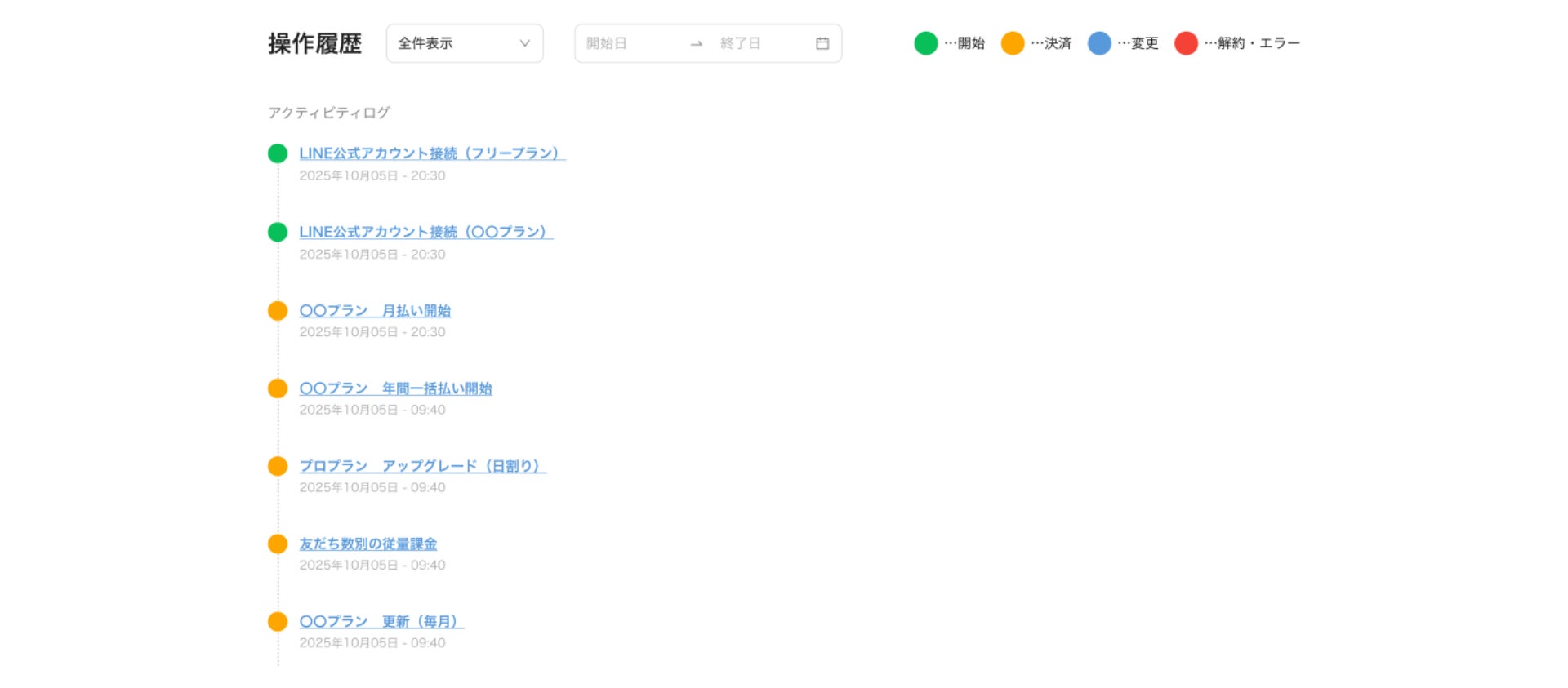 今回のアップデートでは、エルメアカウントの操作履歴が確認できる機能も追加しました。LINE公式アカウントを接続した日時、ご契約日、お支払い日時などを時系列で一覧表示します。