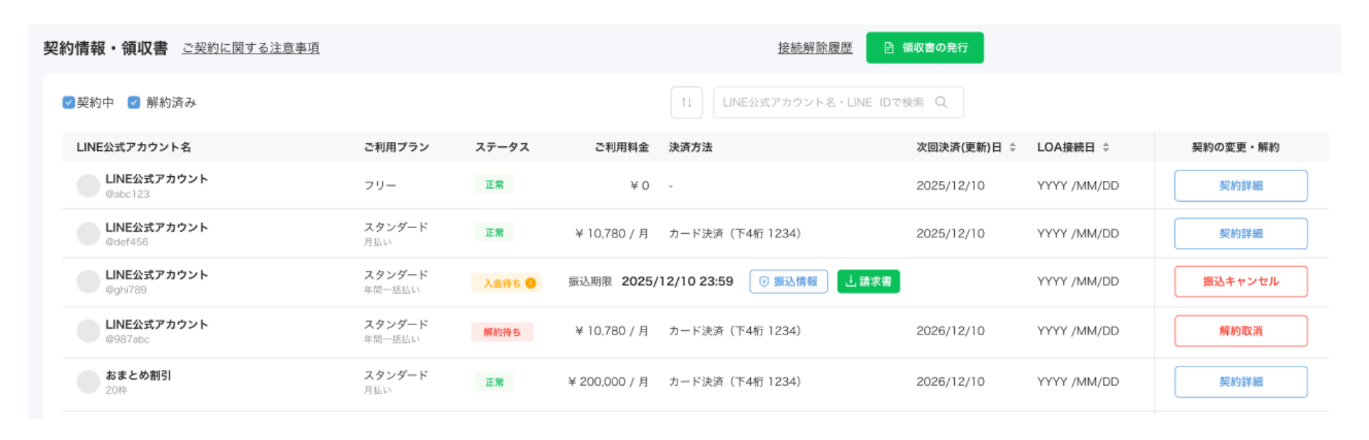 契約情報・領収書ページのデザインを一新しました。アカウントごとの利用料金を一覧で確認できる構成とし、現在の契約内容や支払い状況を把握しやすくしています。
