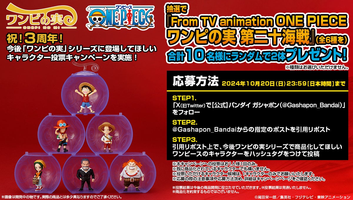 「【公式】バンダイ ガシャポン(@Gashapon_Bandai)」をフォロー、投票いただいた方の中から抽選で「From TV animation ONE PIECE ワンピの実 第二十海戦」(全6種)からランダム2体セットを【合計10名様】にプレゼントいたします。