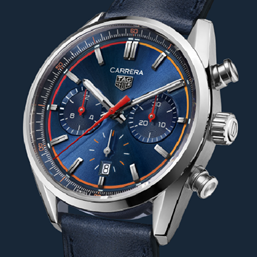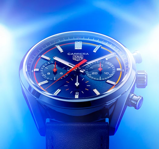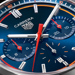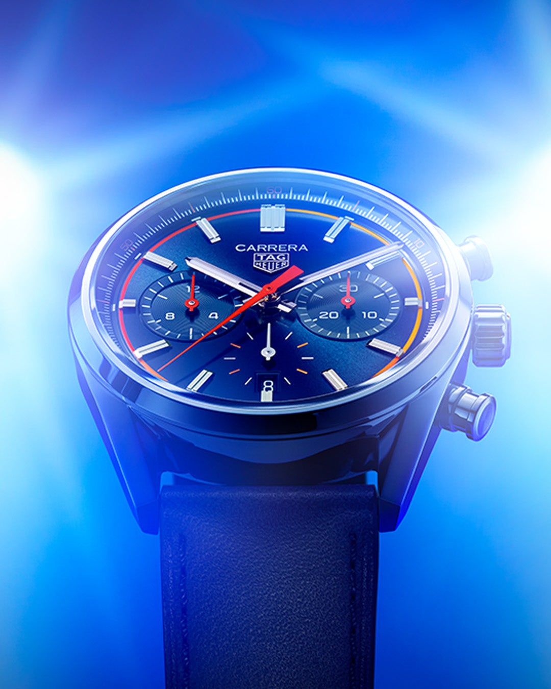 特徴的なブルーのダイヤルとブラックのダイヤルに、グラデーションオレンジのスポーティなディテール。モーターレーシングをテーマにしたタグ・ホイヤー カレラの次世代クロノグラフは、60年の歴史にアクセルを踏み込みます。