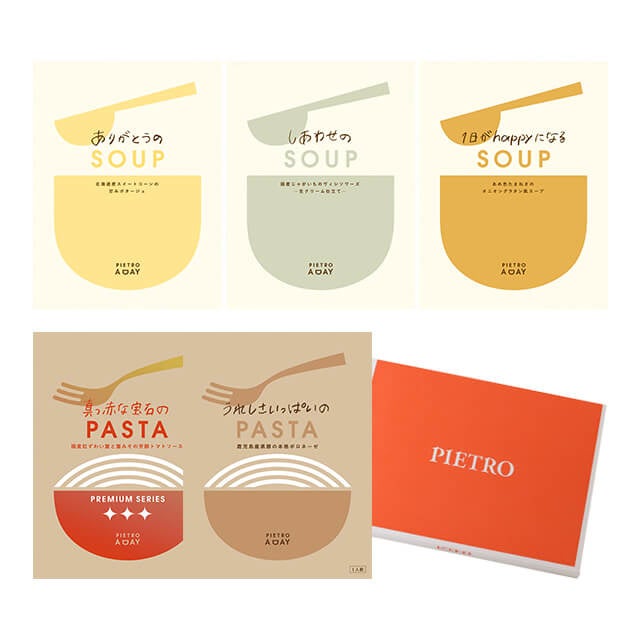 券種・価格:「【ピエトロオンラインストア】ギフトチケット」1,000円、3,000円、5,000円、8,000円、10,000円(非課税) (※1)、「【ピエトロ】1日がhappyになるギフト」5,400円、「【ピエトロ】感謝の気持ちを贈るスープギフト」4,860円、「【ピエトロ】1日がhappyになるセット〈5食〉」2,732円、「【ピエトロ】ベストセレクションギフト」5,400円、「【ピエトロ】にぎやかピザ6枚セット」5,767円、「【ピエトロ】シェフの休日 冷凍パスタ5食セット」5,659円(※1のみ非課税/他全て税込、自社販売サイトは※1のみ取り扱い)