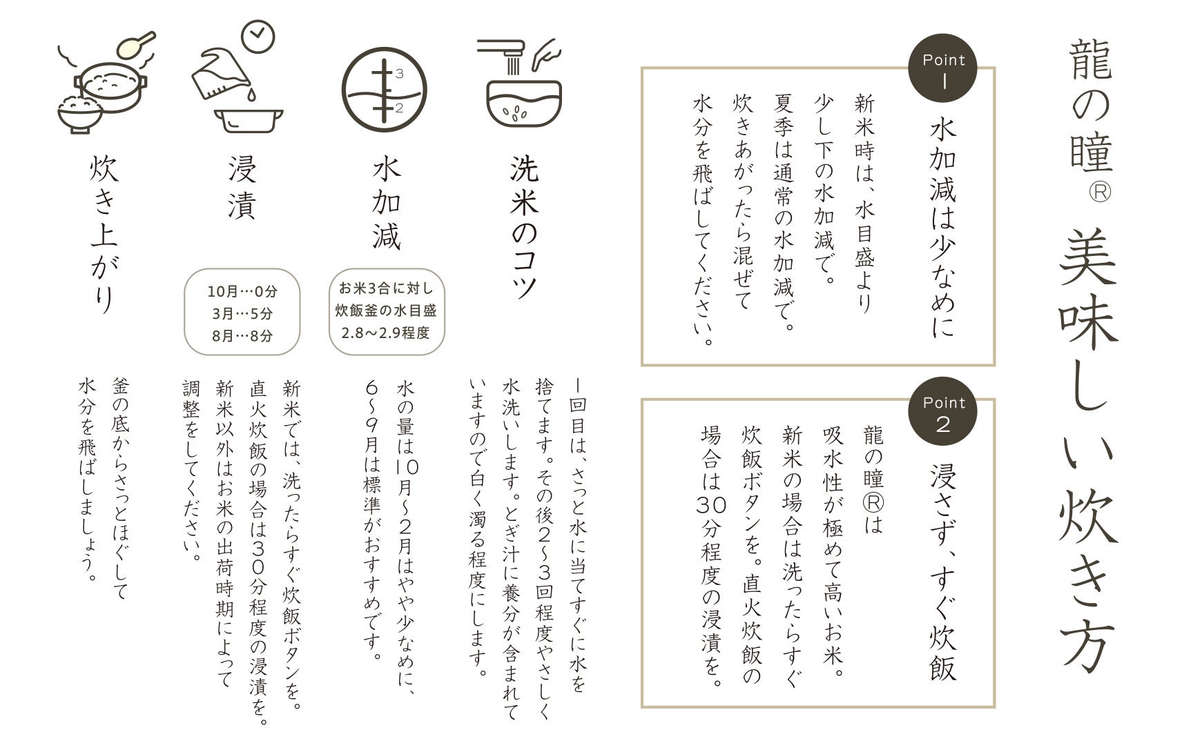 食べごたえのある粒の大きさ。コシヒカリの1.5倍ほどあり、日本最大級のサイズです。そして粘り気と甘味があり、冷めた時も美味しいのが特徴です。「龍の瞳」は他のお米に比べて水を吸いやすいため、炊き方に少し工夫がいります。炊き方によって味が変わるところも特徴のため、水分少な目で炊くのがコツです。正しい炊き方をしてこそ本来のお米の香りの良さ・みずみずしさを感じることができます。