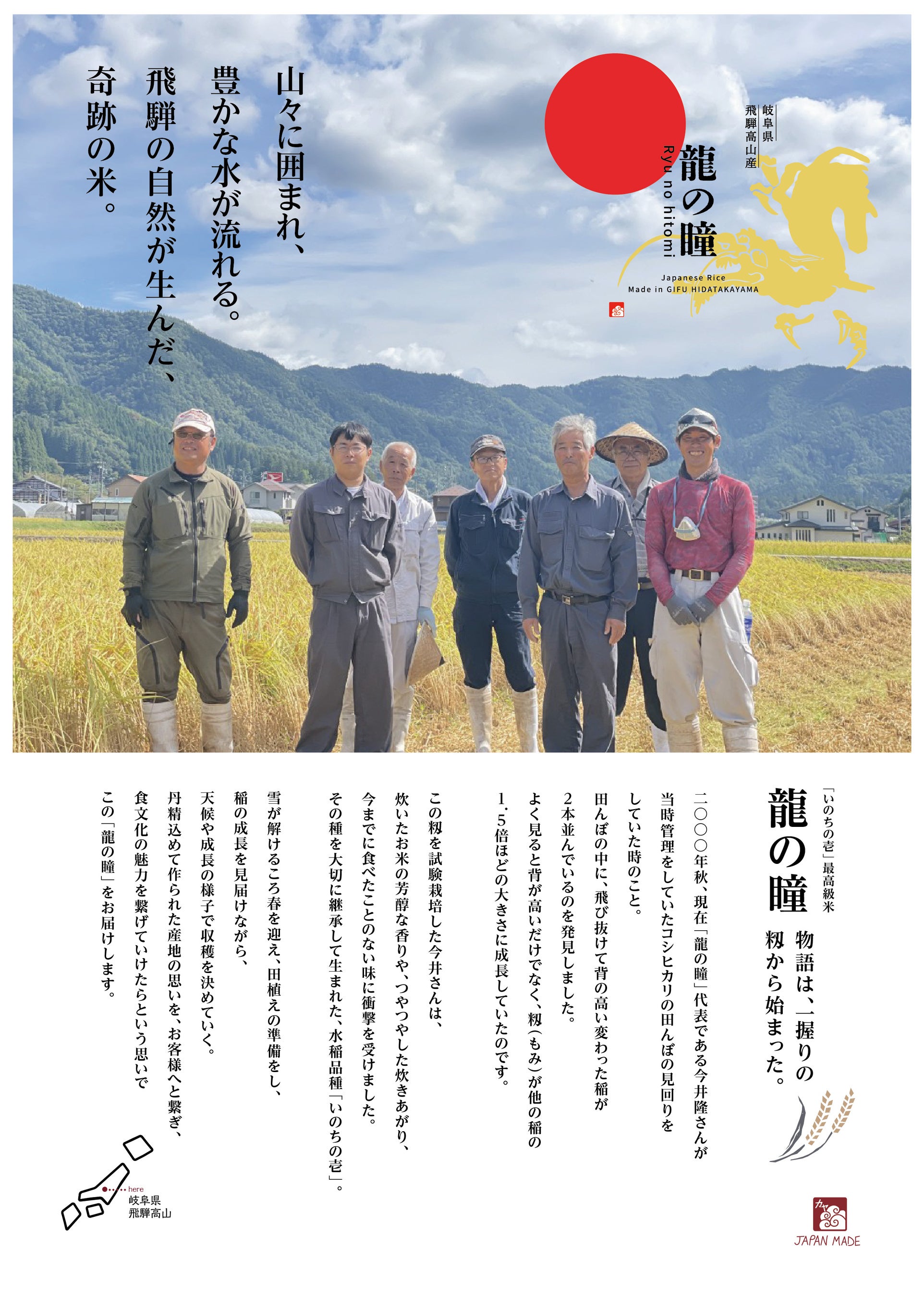 品名:龍の瞳® 品種:いのちの壱 収穫時期:令和5年度新米10月収穫 産地:岐阜県飛騨産