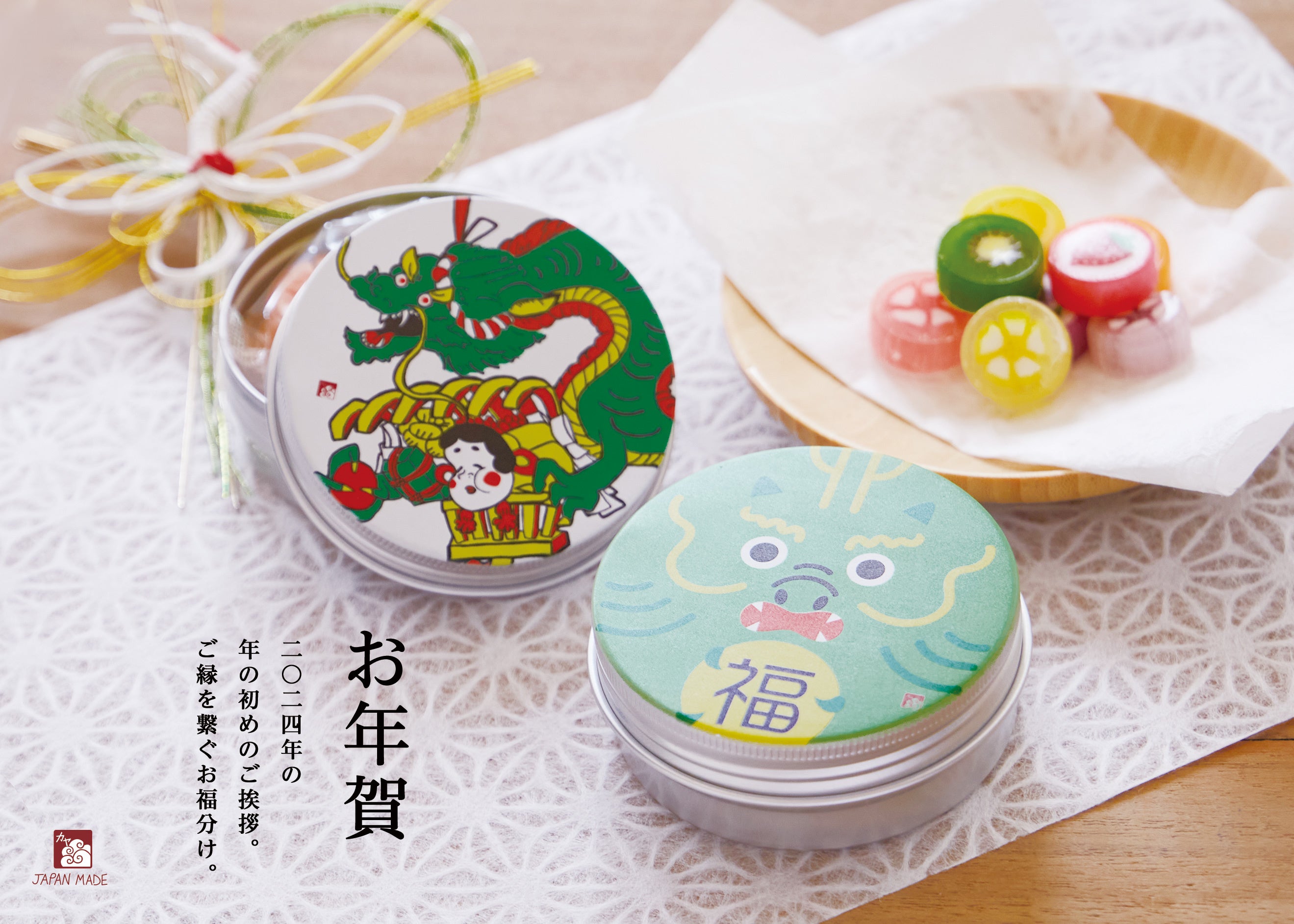 左から時計回り:干支辰布巾 825円、【2024カレンダー】浮世絵 辰 1,540円、重ね龍手拭 1,650円、大辰だるま 1,650円、辰みくじ 715円、干支辰飴缶 583円、辰手拭 1,260円、龍の足袋靴下 660円、双龍 腹巻 ¥3,080