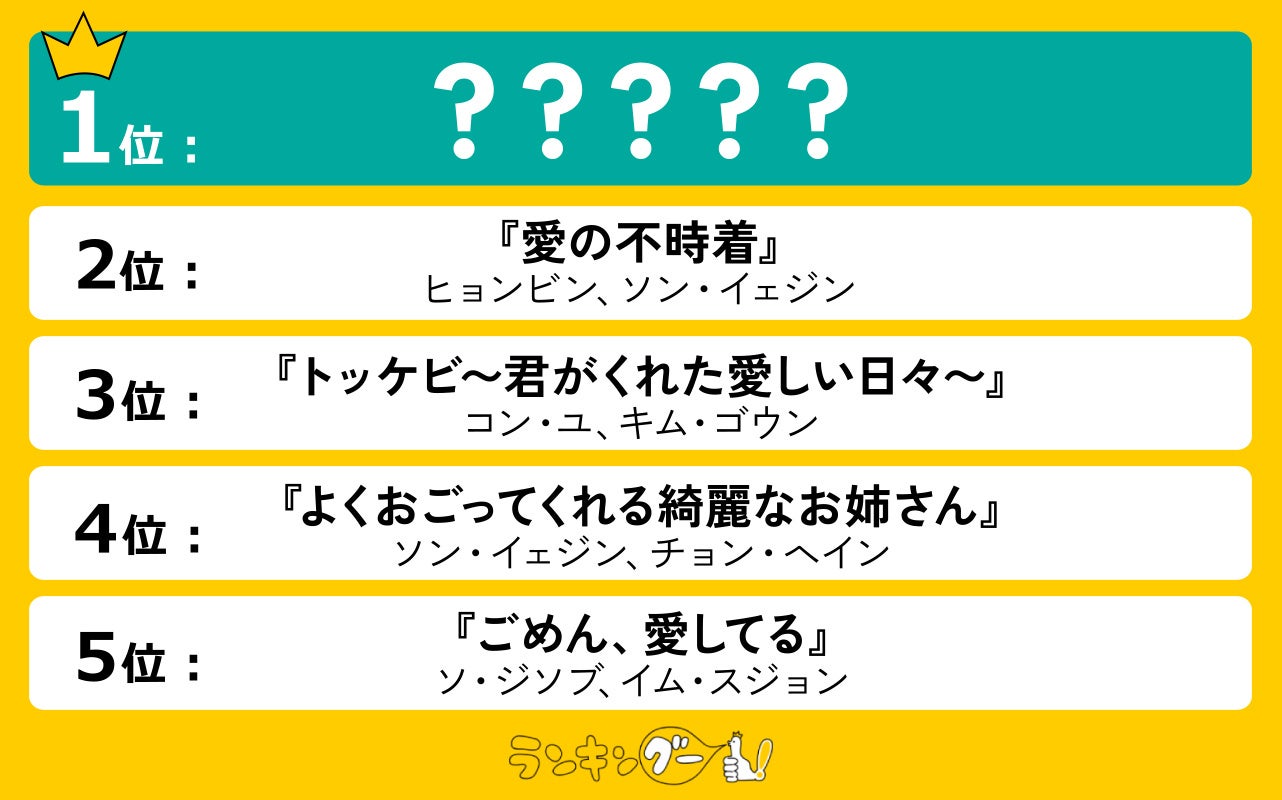 1位は第一次韓流ブームの火付け役となった『冬のソナタ』に決定!2位は、Netflixを通じて世界中で大ヒットした『愛の不時着』。3位は『トッケビ〜君がくれた愛しい日々〜』。4位は『よくおごってくれる綺麗なお姉さん』。そして4位と1票差で5位にランクインしたのは、『ごめん、愛してる』でした!