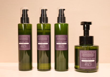スキンケア商品は「OSAJI」を採用。皮膚科学を重視し、健やかで美しい皮膚を保つため、真に安全な化粧品を目指し作られた製品で、お客様の心身の豊かさをサポートします。また、新たな取り組みとして、使用済みのプラスチック容器を回収し、洗浄→粉砕→樹脂化を経て、新たな化粧品ボトルとして再生する仕組み「BEAUTYCLE(ビューティクル)」の導入も発表しており、積極的な環境配慮へ取り組んでいます。