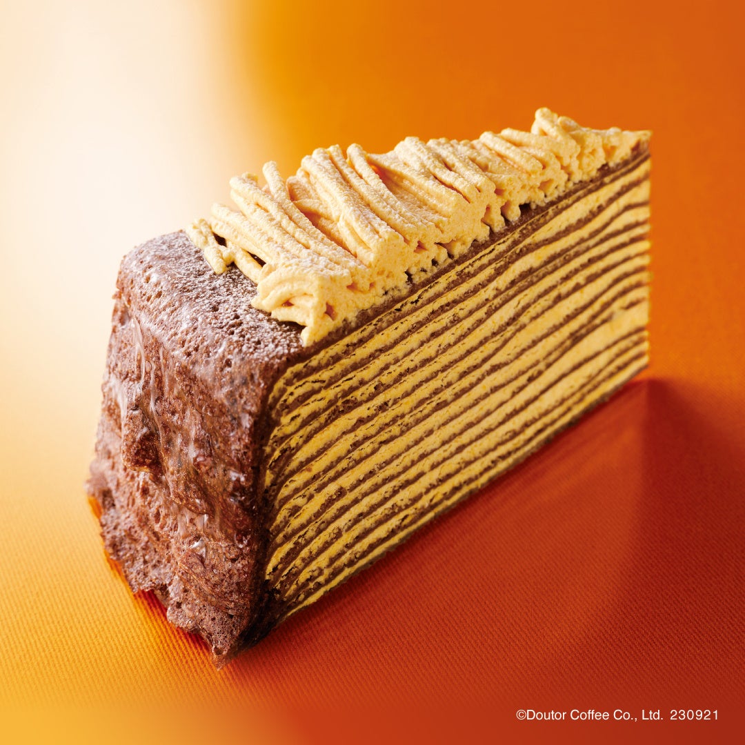 秋の食材かぼちゃを使用した季節限定のミルクレープです。ショコラクレープ生地にかぼちゃクリームをサンドしており、層のコントラストも鮮やかな一品です。天面にもかぼちゃクリームをしぼり、華やかに仕上げています。