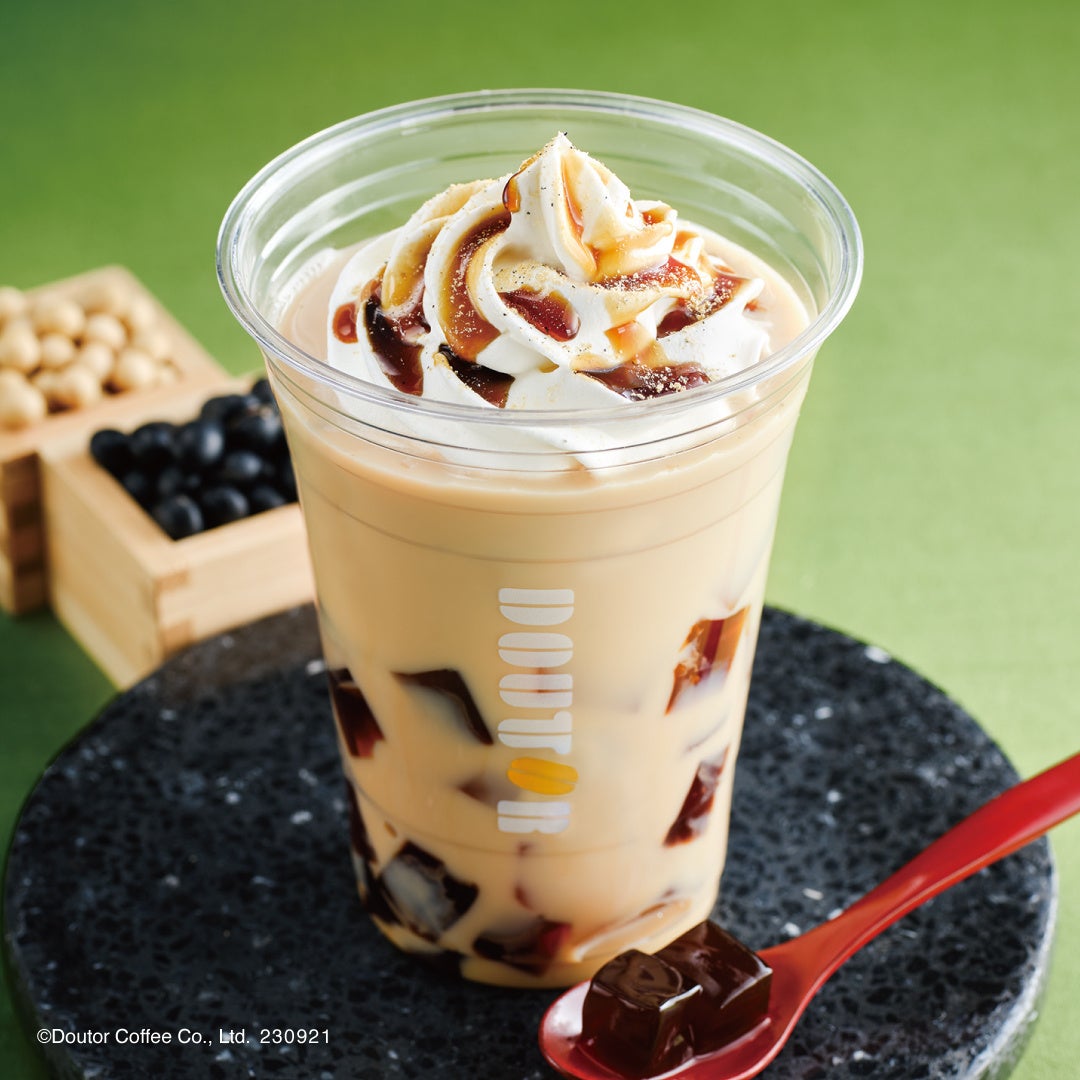 豆乳に沖縄県西表島産の黒糖を使用した黒糖ソースと国産の丹波黒豆きなこを混ぜ、豆乳ホイップと黒糖ソース、きなこをトッピングした秋の定番「きなこ豆乳オレ~まめホイップ~」に、沖縄県産黒糖から作った黒糖蜜を使用したゼリーを合わせた新作ドリンクです。ぷるぷるとしたゼリーの食感をぜひお楽しみください。