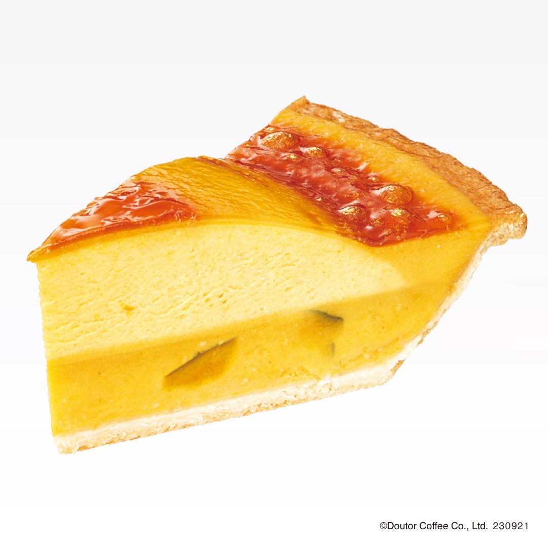 北海道産のかぼちゃを使用した、食べ応えのあるケーキです。タルト生地の上に、皮付きのダイス状のかぼちゃを加えたかぼちゃプリンを重ねて、ふんわり軽い食感のかぼちゃのムースをのせました。天面のカラメルが見た目のアクセントと全体の味をまとめています。