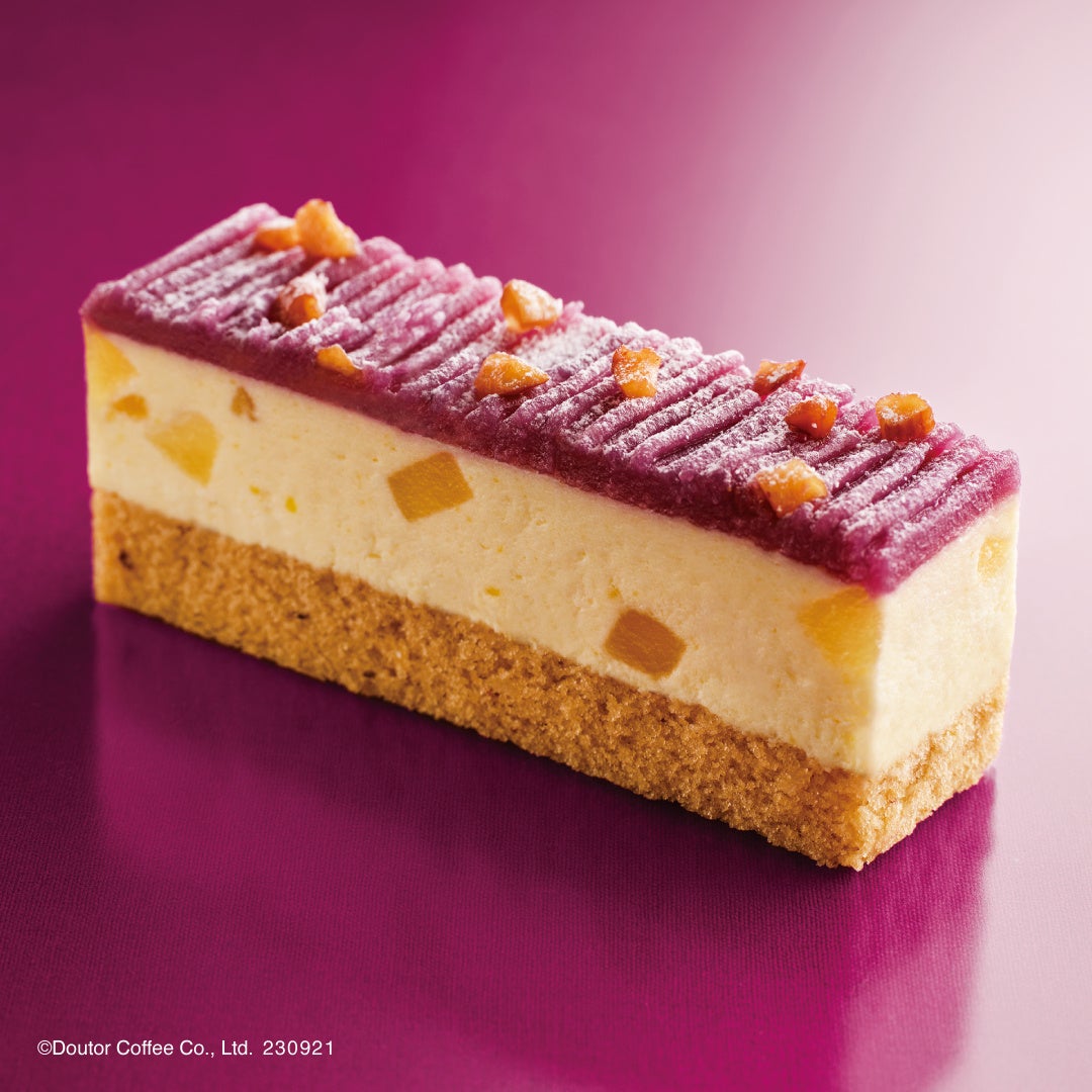 ヘーゼルナッツ風味のスポンジ生地の上に、シロップ漬けしたりんご入りの黄金芋のムースを重ね、天面にはしっかりとさつまいもの風味を味わえる紫芋クリーム(紫優[ムラサキマサリ]使用)をしぼっています。ムースに入れたりんごの甘酸っぱさや食感、天面のナッツの食感などもアクセントになっています。紫優と黄金芋の2種類を使うことで、さつまいもの風味をたっぷり味わっていただきながら彩りも楽しめる、秋に食べたいケーキに仕立てています。