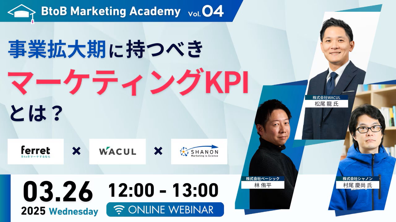 2025年3月26日開催ウェビナー「BtoBマーケティングアカデミー vol.4 事業拡大期に持つべきマーケティングKPIとは?」にWACULが登壇します。