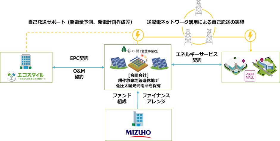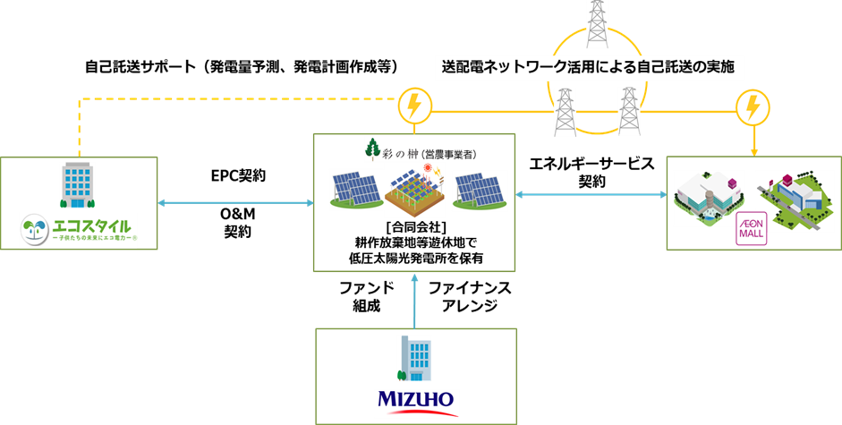 本PJにおいて、エコスタイルは発電所の設置から運用と保守(O&M)や自己託送の導入・運用のサポート、彩の榊は営農事業者の立場から榊の栽培を担い、イオンモールは発電事業者や電力需要家の位置づけとなり、みずほグループ各社はファイナンスアレンジの提供やスキーム構築等に関する助言、リスクマネーの供給を行うことを想定しています。各社は本PJを通じて、わが国の再生可能エネルギー拡大及び国産榊の普及に貢献していきます。