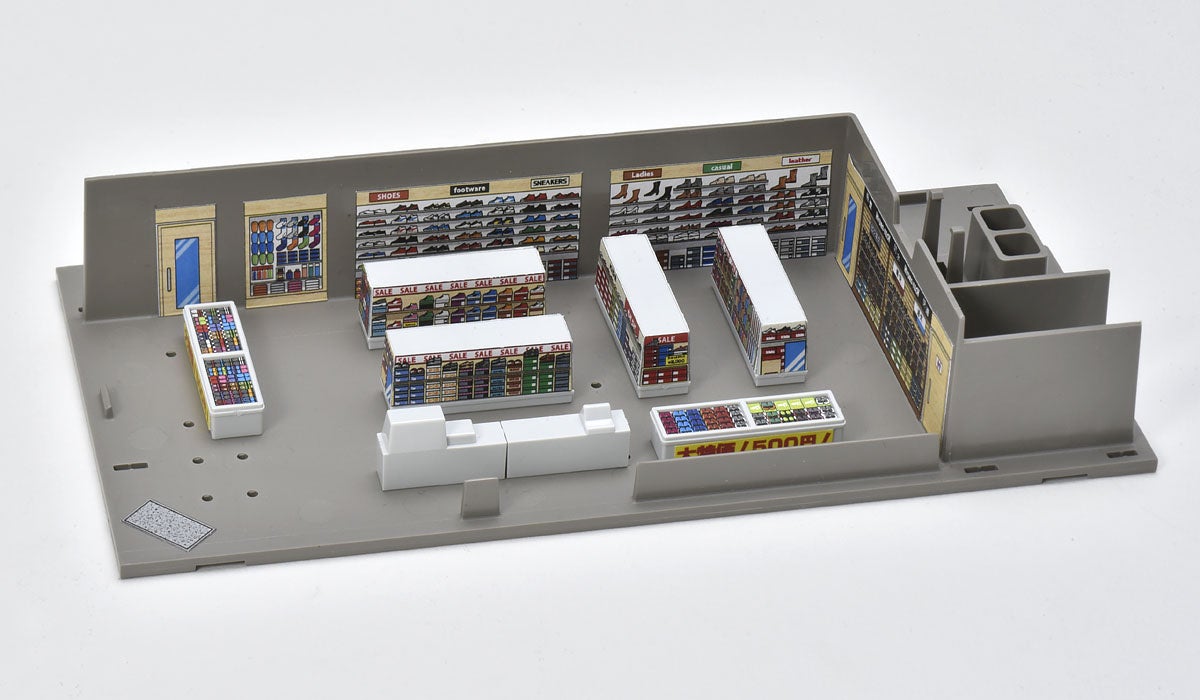 今回発売される模型は、その特徴的なギザギザ屋根や大きな看板を忠実に再現!そして外観だけでなく、店内もおもちゃや靴の専用シールで商品棚を演出できる、マニアにはたまらないアイテムです!