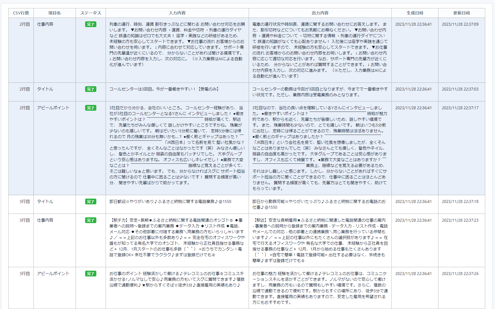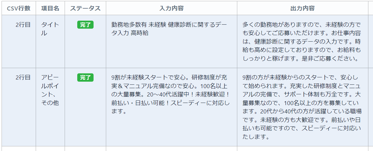 既存の求人データファイルをANDASUに取り込ませることで、一括してタイトルやPR文などをリライト(書き換え)する機能です。その際に任意の項目を選択して必要な箇所のみをリライトさせることが可能です。