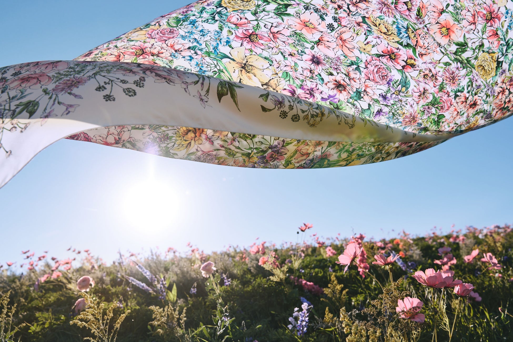 したテキスタイルが宙に舞うインスタレーションを展示。可憐に舞い踊る花々に囲まれるかのようなイマー
