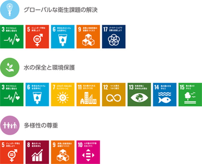 LIXILでは、「世界中の誰もが願う、豊かで快適な住まいの実現」というPurpose(存在意義)の実現を目指して、急速に変化する世界において日々の暮らしと社会にインパクト(良い影響)を生み出す製品やサービスの開発に取り組んでいます。特に、「グローバルな衛生課題の解決」「水の保全と環境保護」「多様性の尊重」の3つを優先取り組み分野として、事業活動を通じてさまざまな社会問題の解決を図ることで、SDGsの達成に貢献しています。
