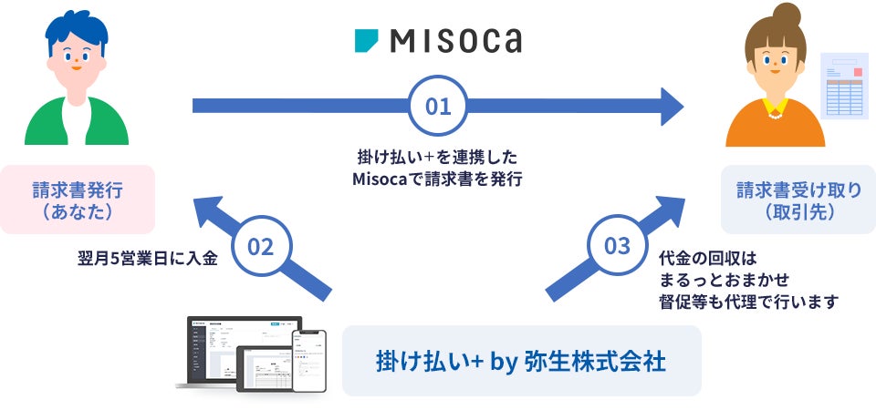 クラウド請求書作成ソフト「Misoca」で請求書を作成、送付することで、その後の管理はすべて「掛け払い+ by 弥生株式会社」が代行。万一の未入金時もプロが督促を担当します。