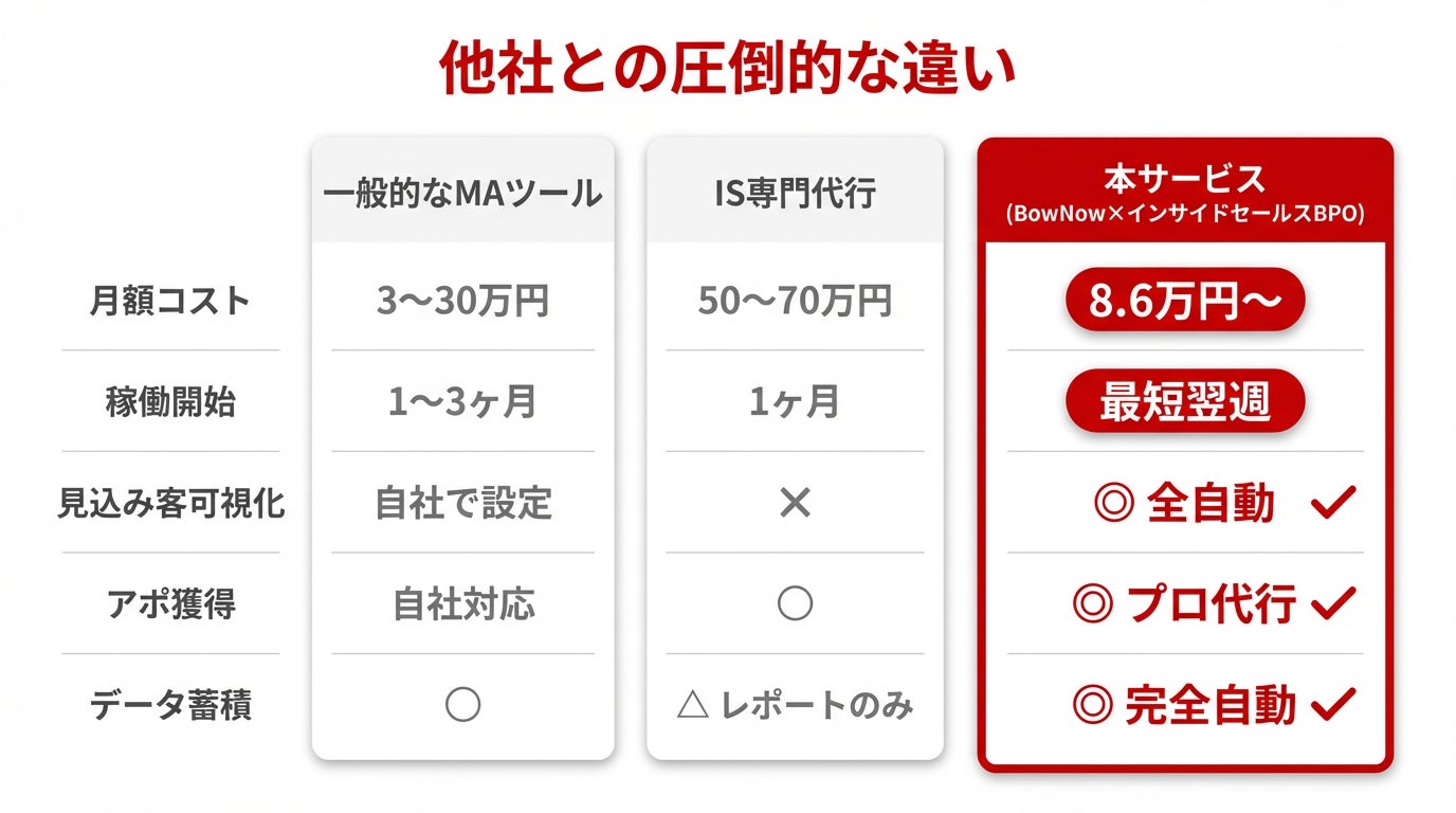 従来、企業が新規商談を創出するには、「MAツール導入→運用担当者の確保→インサイドセールス体制構築」という3つのハードルがありました。本サービスは、これらを月額8.6万円の1パッケージに統合。初期投資ゼロ、最短翌週稼働で、すぐに商談創出体制を構築できます。