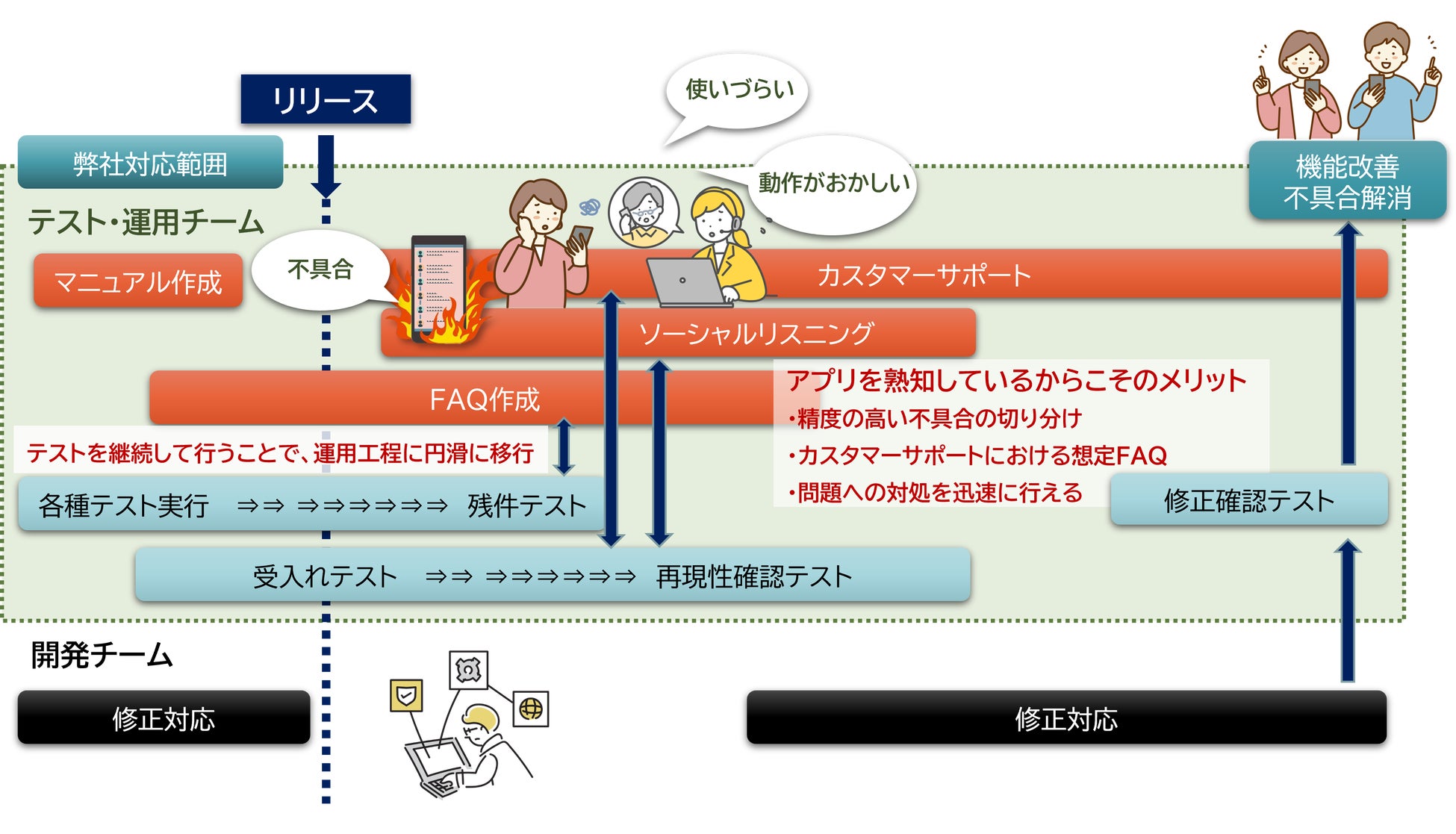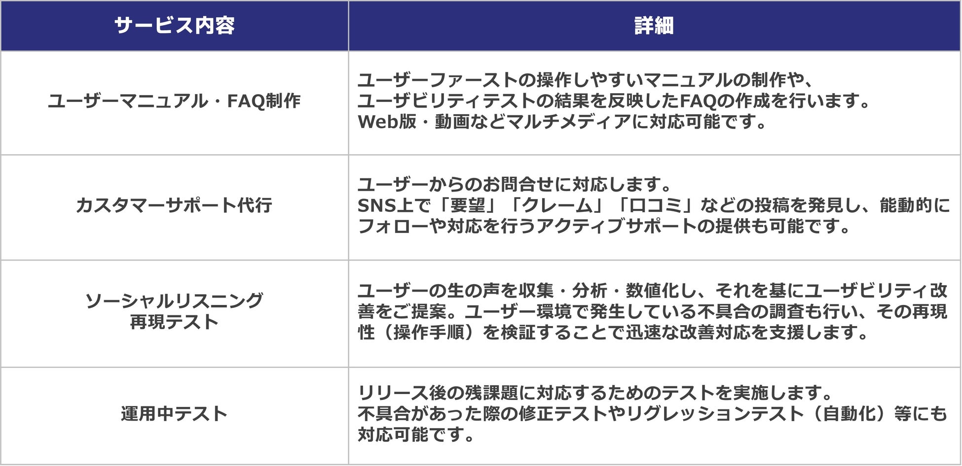 本サービスでは、まずリリース前の準備として、ユーザーがストレスなくスムーズに利用できるようユーザー目線でのわかりやすいマニュアルやFAQを作成します。リリース後には、お問い合わせへの対応代行に加えて、SNS上に投稿されたユーザーボイスの収集・分析を行い、 “リアルな声”を基にしたユーザビリティ改善などをご提案します。また、収集したユーザーボイスから不具合に関する情報が検出された場合には、ハードウェア/ソフトウェア検証の知見を活かし「不具合発生までの操作手順」や「ユーザーの使用環境」など発生状況の再現検証を行なったうえでのご報告や、改善後の修正テストやリグレッションテスト等にも対応可能です。