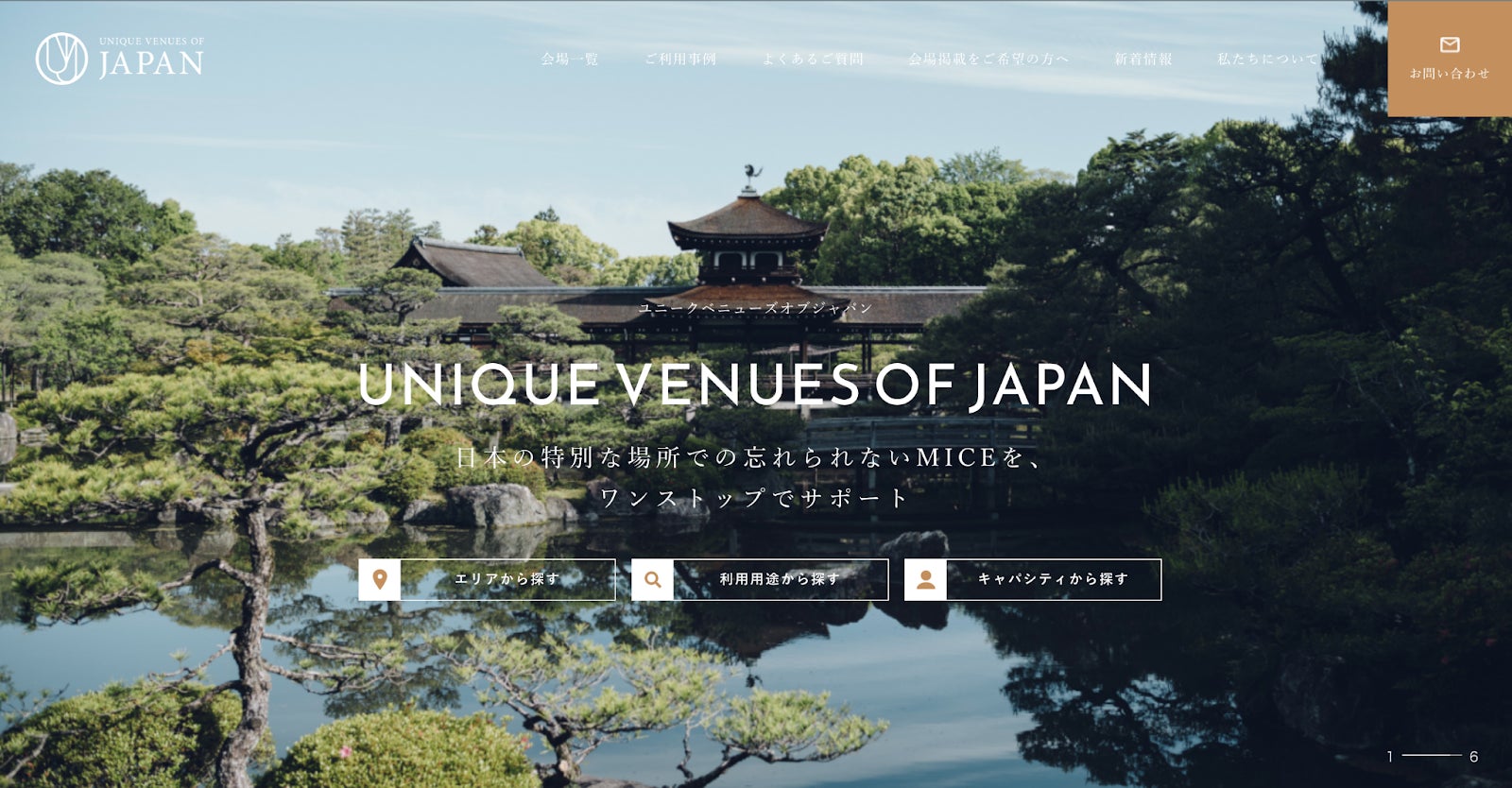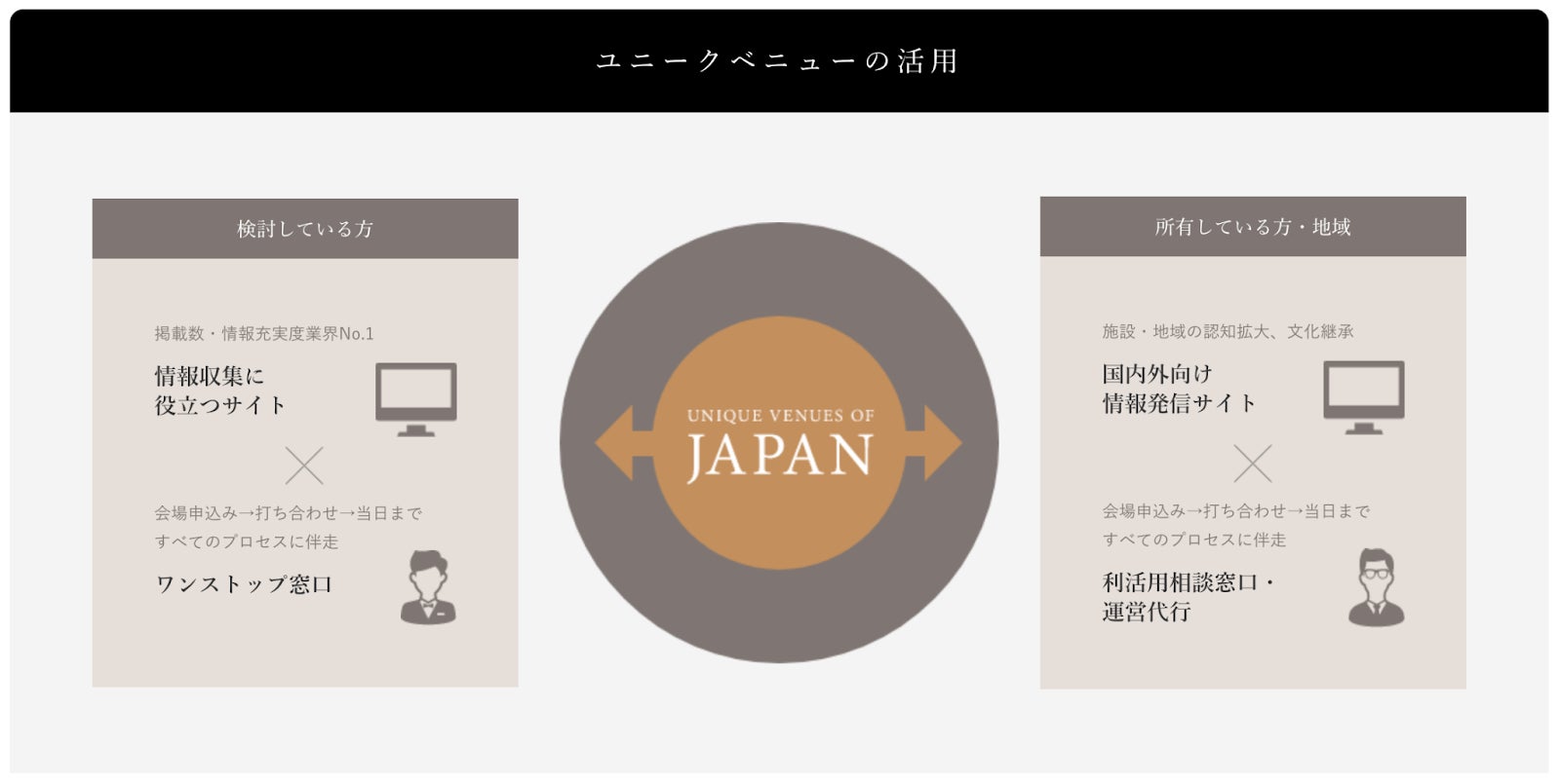 そこで当社は、日本各地の厳選したユニークベニューの情報を一元的にまとめた「UNIQUE VENUES OF JAPAN」を立ち上げました。