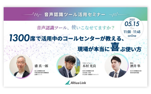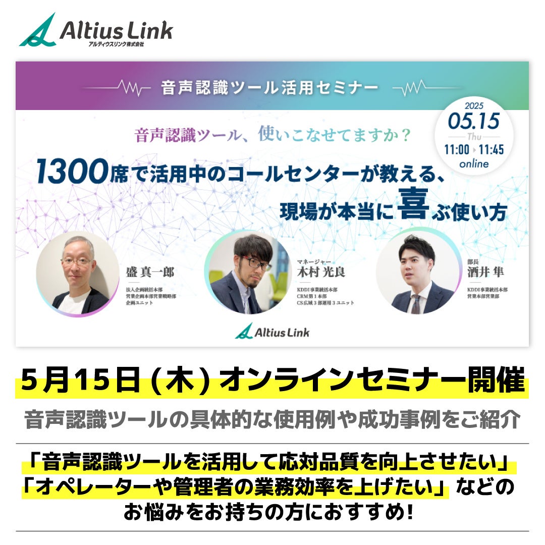 アルティウスリンク株式会社(所在地:東京都渋谷区、代表取締役社長:若槻 肇、以下 アルティウスリンク)は、5月15日(木)にオンラインセミナー「音声認識ツール、使いこなせてますか?1,300席で活用中のコールセンターが教える、現場が本当に喜ぶ使い方」を開催します。