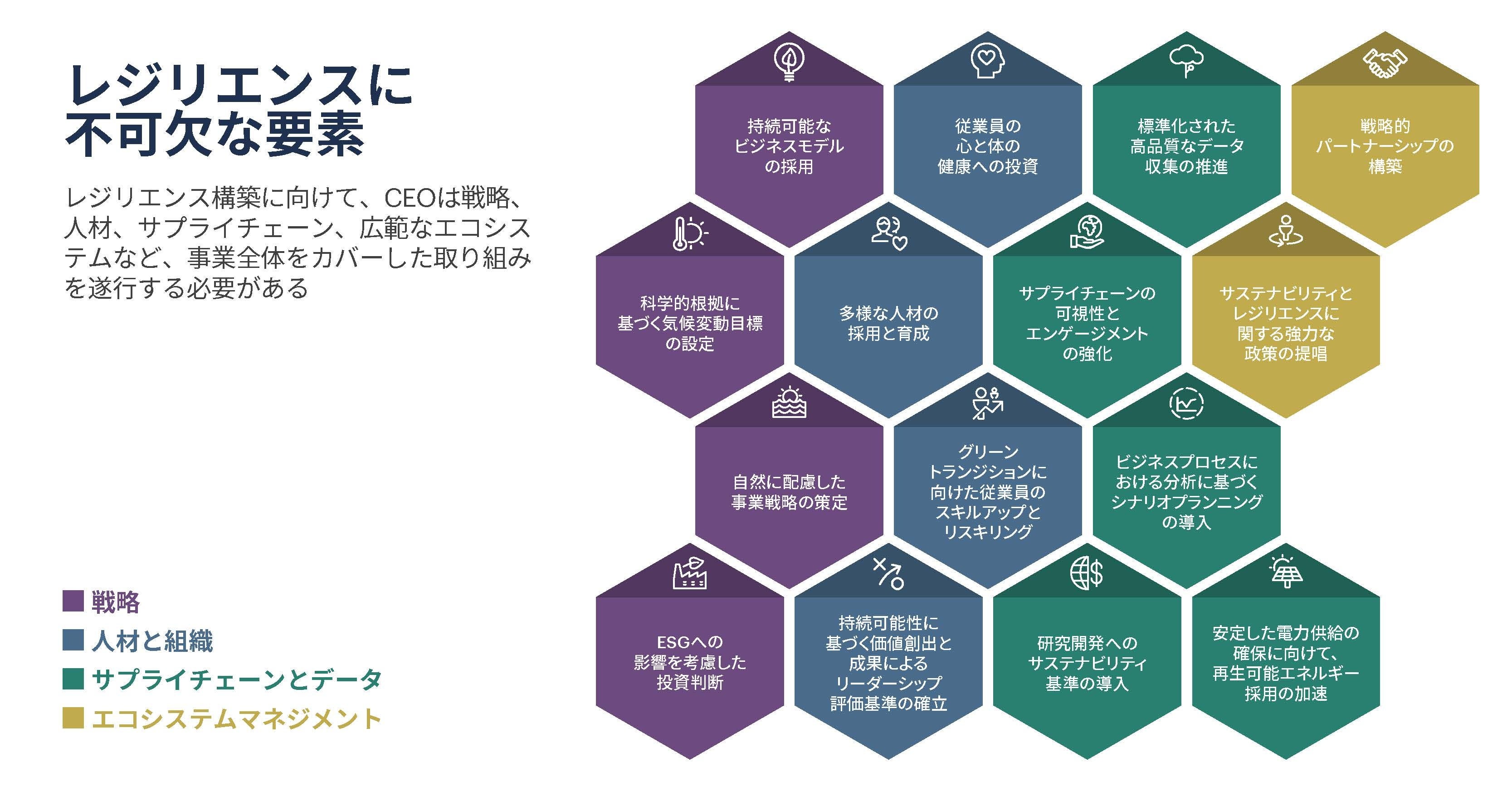 インタビュー調査では、企業のレジリエンスを構築するための主要な取り組みとして、科学的根拠に基づく気候変動目標の設定、従業員の多様性への投資、テクノロジー・ソリューションに関する業界の枠を超えたパートナーシップの締結、サプライチェーンの可視性の向上、生物多様性保全の促進」などが挙がりました。さらに政府に対しては、標準化されたESGレポートのフレームワークの構築、二酸化炭素排出量取引市場の確立、持続可能なビジネスモデルへの奨励金など、長期的に測定可能な目標を優先した政策*¹への切り替えを求めていることも分かりました。