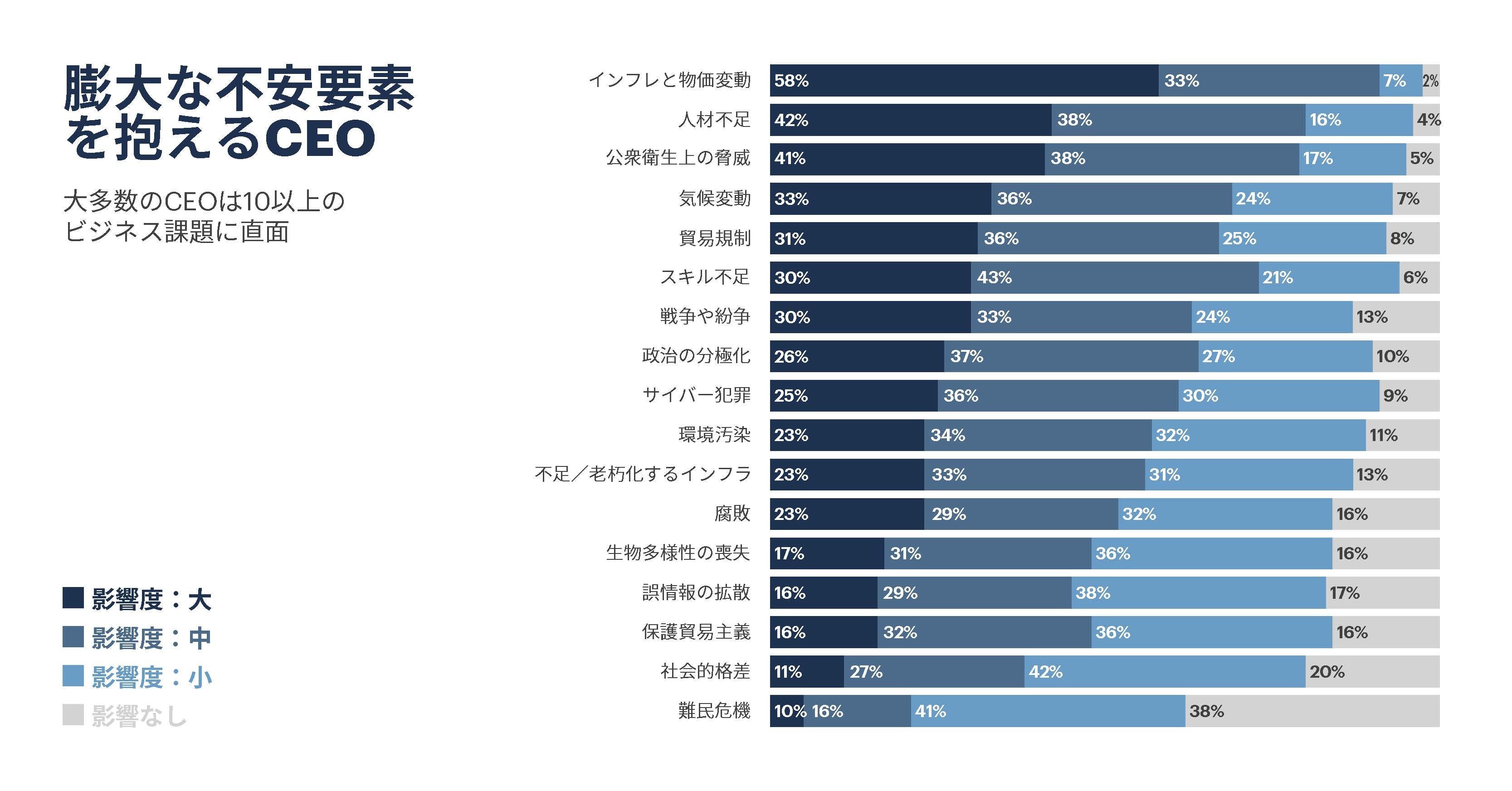 今回で12回目となった国連グローバル・コンパクトとアクセンチュアによるCEO調査レポートは、128カ国18業種の2,600名以上のCEOを対象とした調査と130名以上に実施したインタビューの結果に基づいています。なお、日本では132名が本調査に参加し、11名がインタビューに応じました。今回の調査対象にはグローバルサウス(南半球を中心とする途上国)のCEOも含まれており、2007年の調査開始以来、最大の調査規模となりました。この最新調査では、多国間主義の失速、不安定な社会経済、サプライチェーンの途絶、気候変動の影響など、企業と社会が直面しているさまざまな問題がもたらす影響に対し、CEOが警戒している現状を明らかにしています。