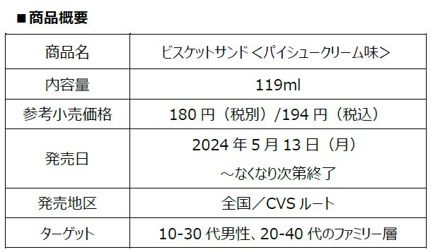 森永製菓株式会社(東京都港区芝浦、代表取締役社長・太田 栄二郎)は、お店で手作りのシュークリーム専門店(国内約 273 店舗・海外 10 ヵ国と2地域に202店舗を展開中(※2024年3月末時点 ※ビアードパパのみ))の「ビアードパパの作り立て工房」を運営する株式会社DAY TO LIFE(大阪市北区、代表取締役・杉内 健吉)とコラボレーションした「ビスケットサンド<パイシュークリーム味>」を、2024年5月13日(月)から期間限定で新発売いたします。