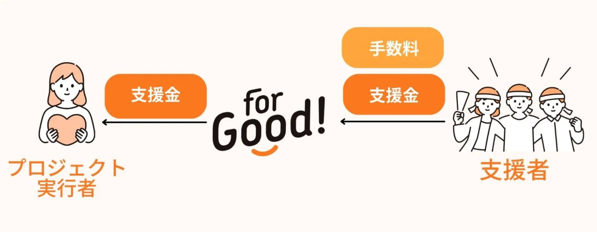 大手クラウドファンディングサービスの掲載手数料は支援総額の9~17%に対して、For Goodは0円。支援する人が手数料*を負担し、実行者を支えることで、プロジェクト実行者は集まった支援金を全額受け取ることができます。