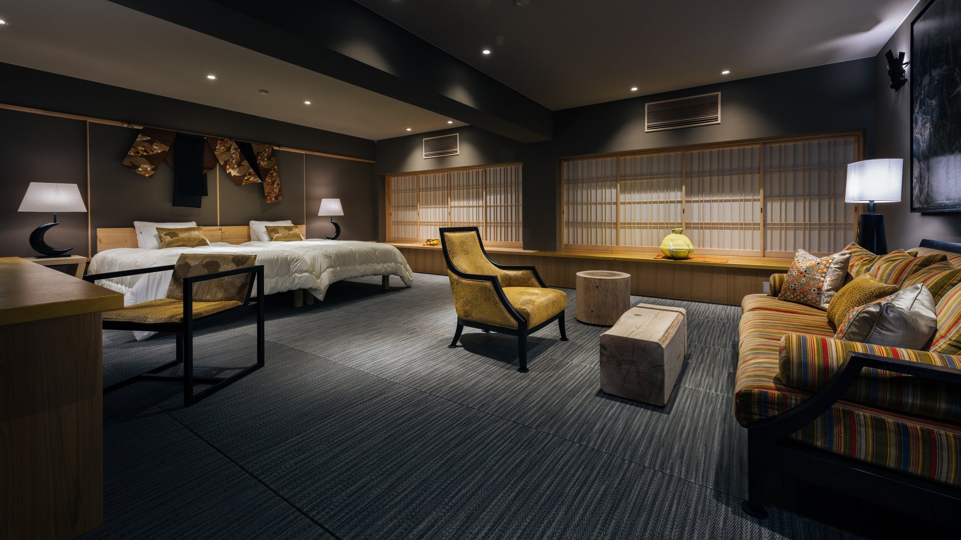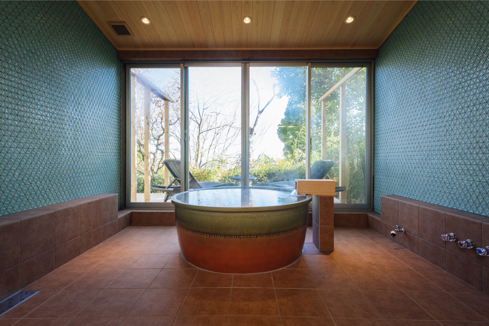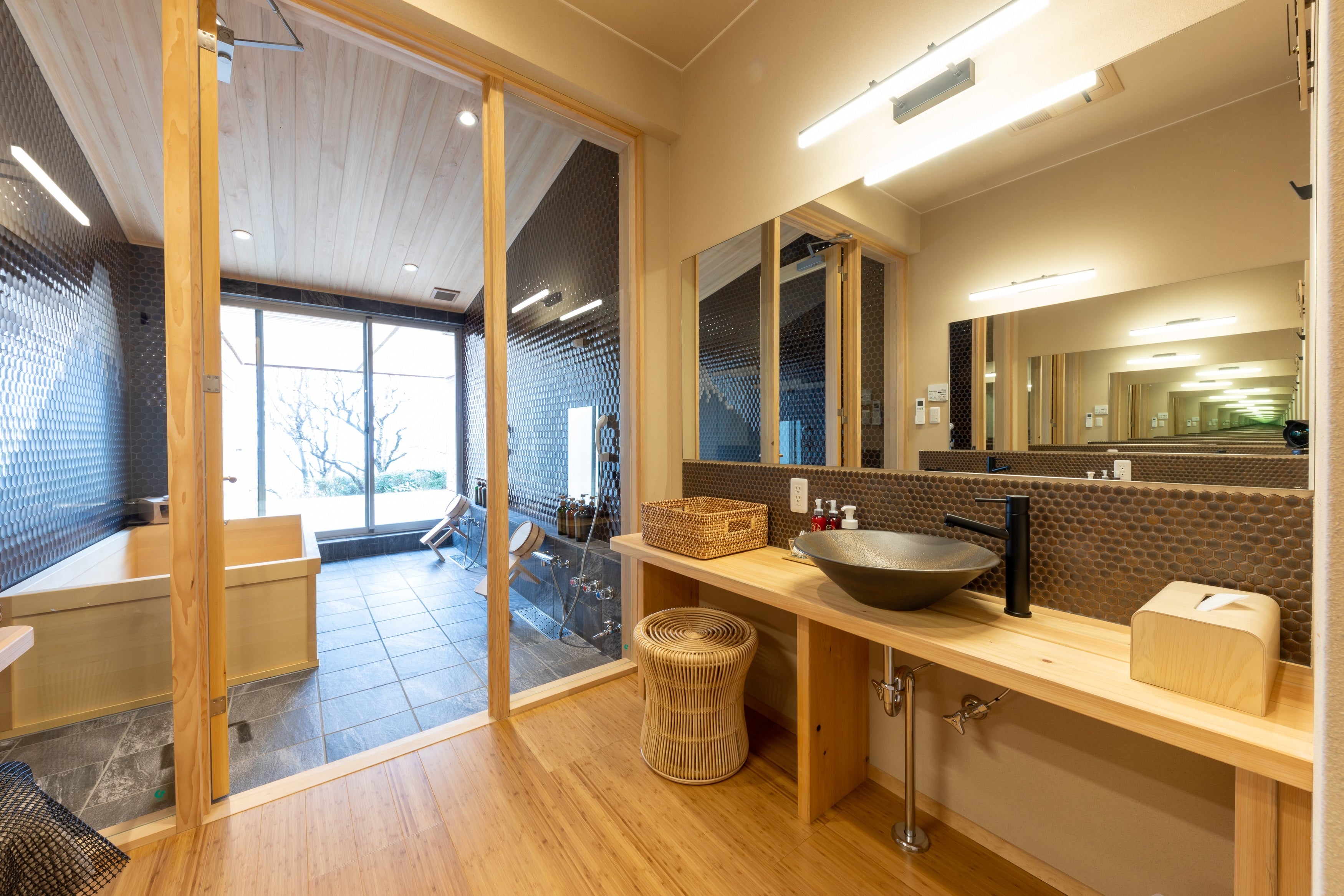 奥のダイニングスペースはヒノキの間伐材を使用した大きなダイニングテーブルに、大きな窓とその先にはテラスがあり海を見晴らす絶景をお楽しみ頂けます。2種類の浴室はそれぞれ信楽焼・桐の浴槽を備え付け熱海の温泉を楽しむことができます。2階・3階には計4つの客室があり、3人の国際的なデザイナーによって異なるコンセプトでデザインされており、伝統技法やデザイン技術、アートが凝縮された客室です。