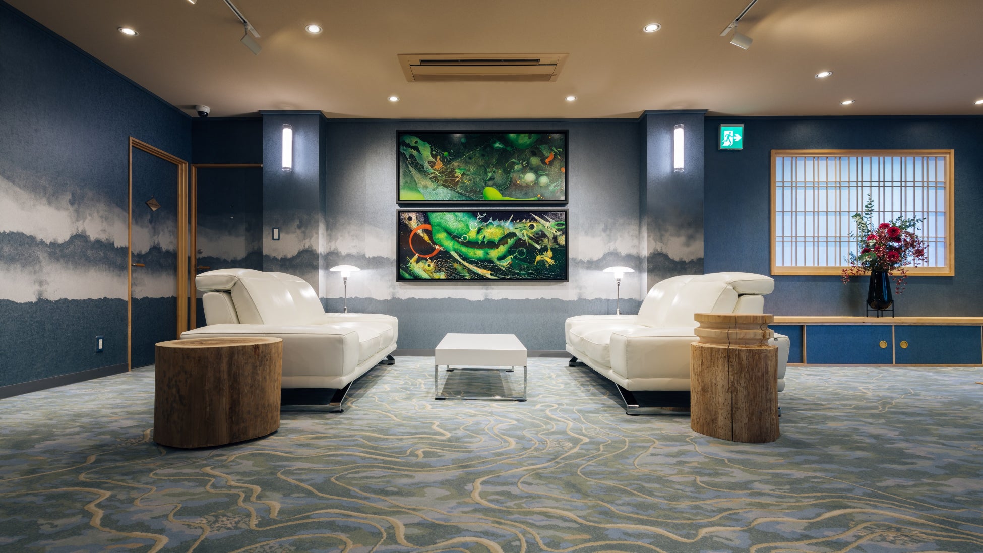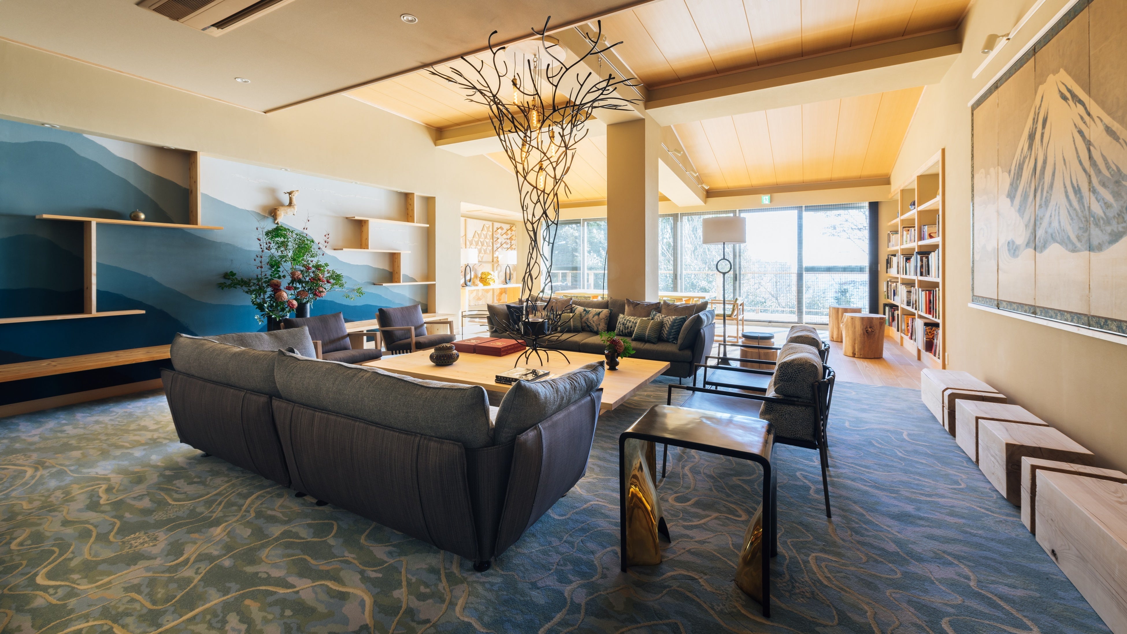 リビングスペースは、研修やサロンコンサートにも利用可能な、天井高3.9m、約100㎡の大空間です。中央には森の枝のイメージを取り入れたデザインの照明、壁面には幕末期に海外へ流出したアートを里帰りさせディスプレイしました。その一つは幅約3.6m、高さ約1.6mという大きさの琳派による富士の屏風絵(1800年)です。