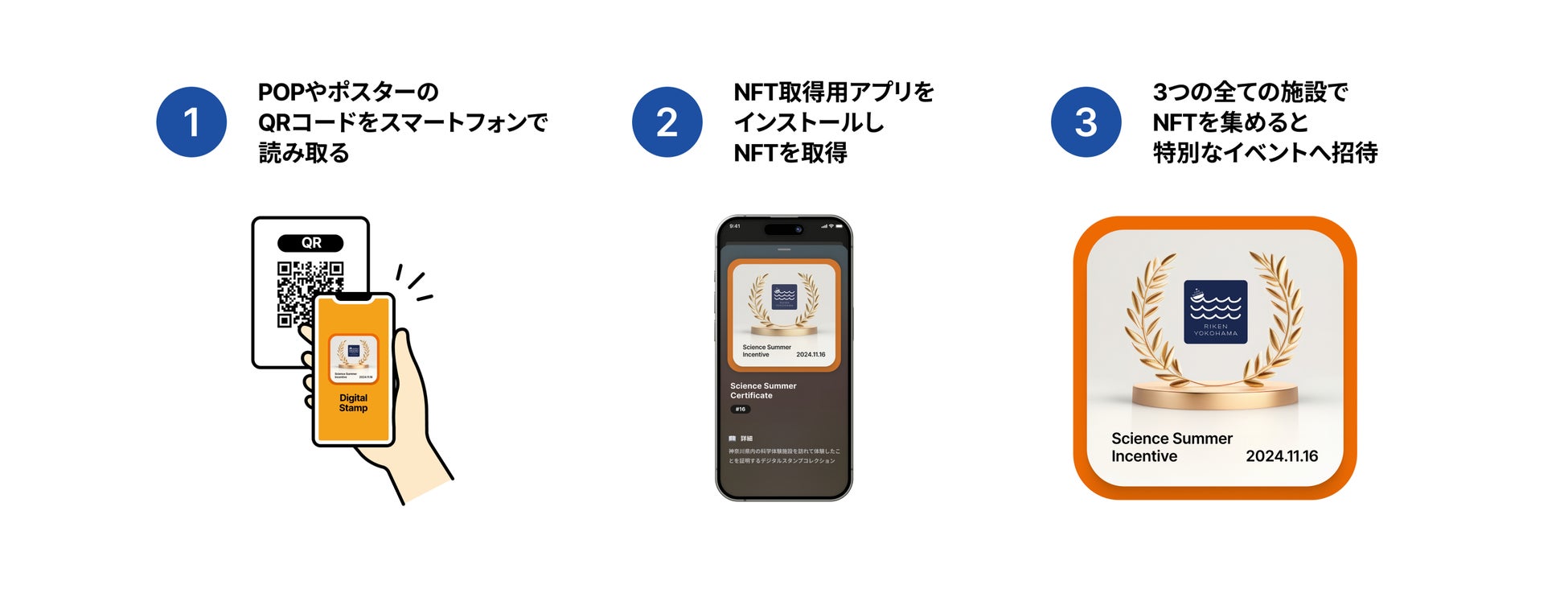 「かながわサイエンスサマー」に参加した体験と思い出を、NFTによって記録する、子ども向けのイベントです。NFTは、ブロックチェーン技術により世界で一つしかないものであると証明することができ、8月1日(木)から10月15日(火)の期間中、神奈川県内の3つの施設で取得できます。また、すべてのNFTを集めた参加者を、抽選で、11月16日(土)の理化学研究所 横浜キャンパス一般公開にあわせて実施する特別なイベントへ招待します。