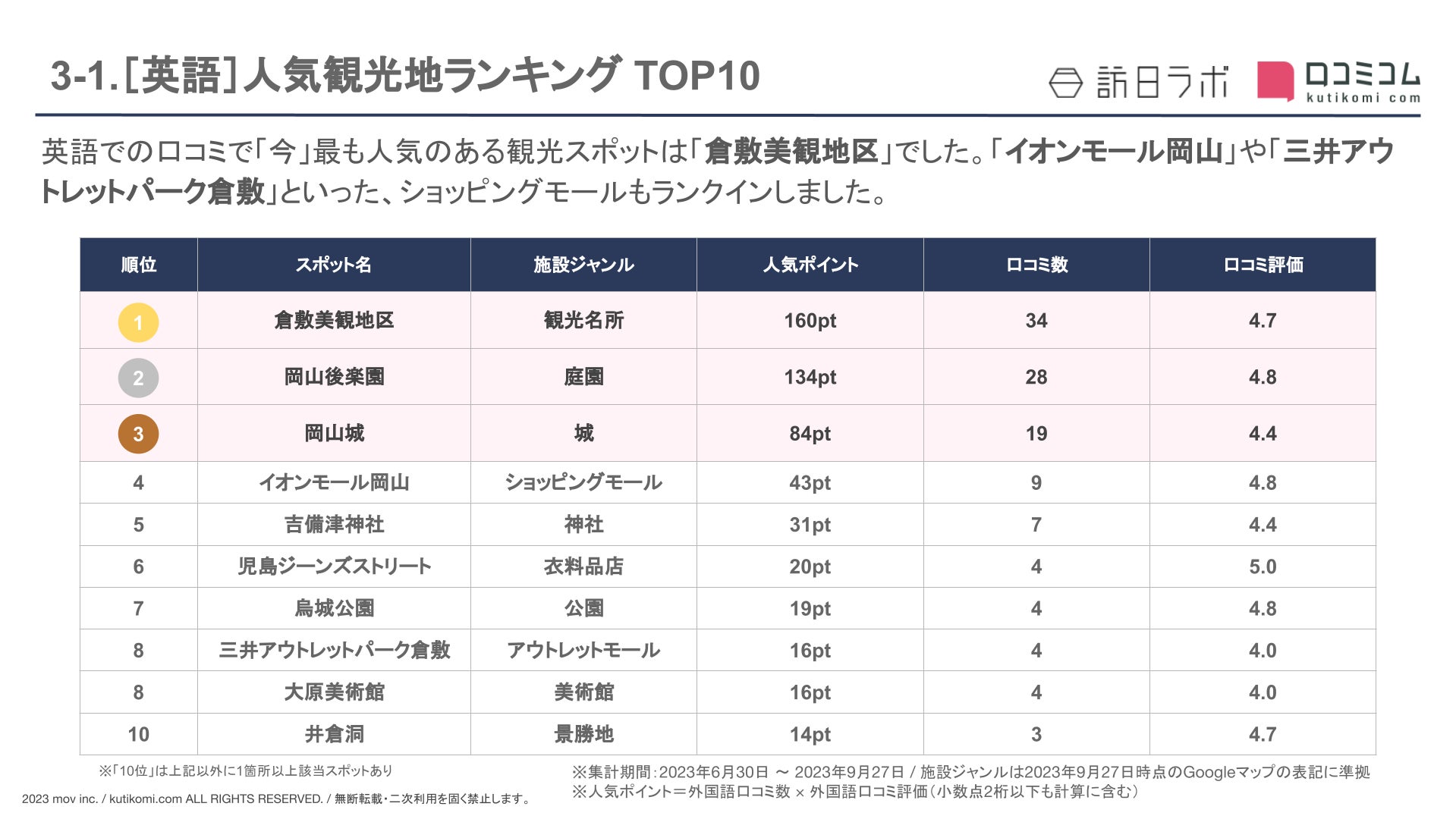 」と2位の「岡山後楽園」の英語での口コミによる人気ポイントはいずれの観光スポットでも100ptを超える結果となりました。