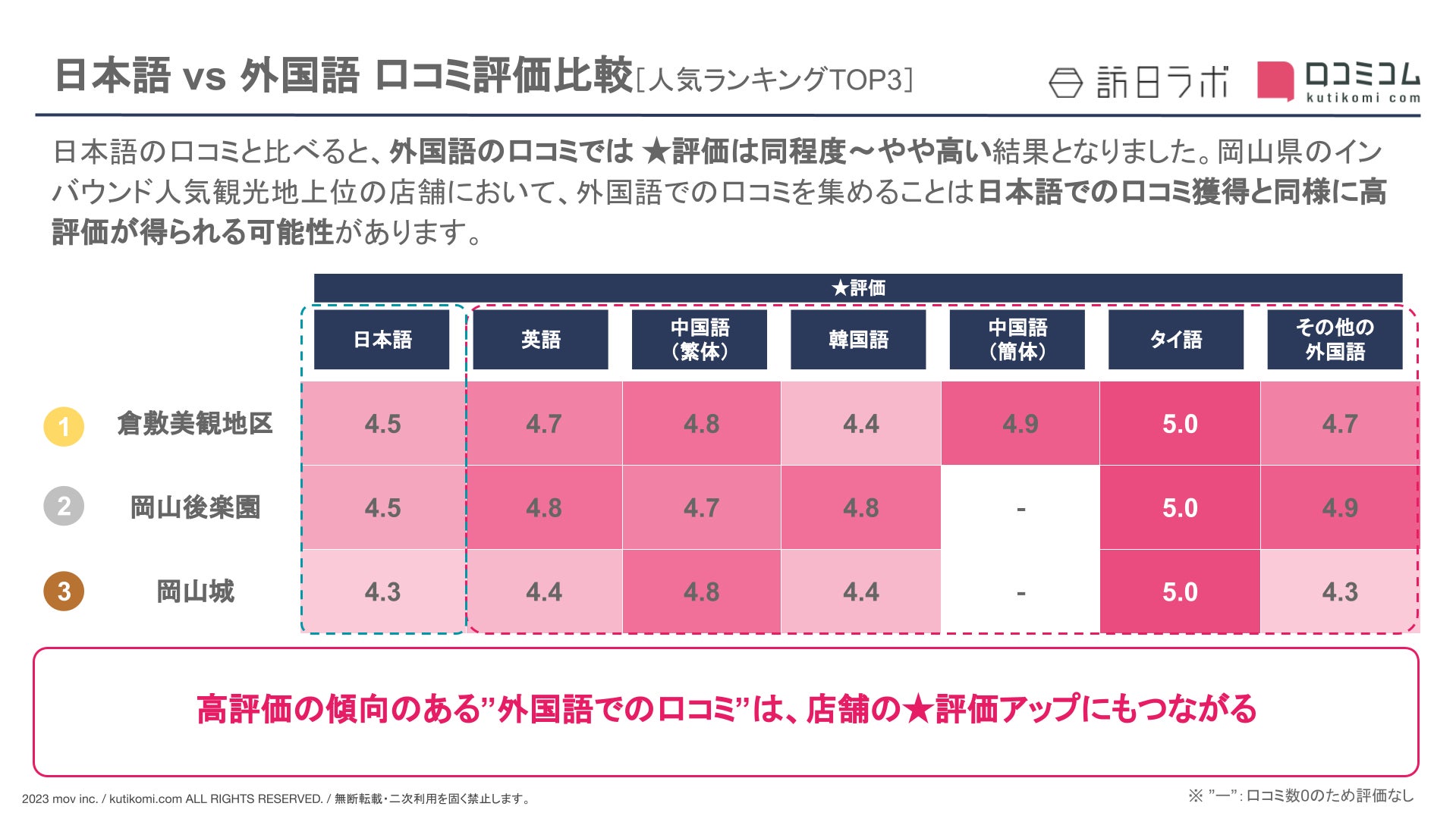 日本語の口コミと比べると、外国語での口コミでは、★評価は同程度〜やや高い結果となりました。岡山県のインバウンド人気観光地上位の店舗において、外国語での口コミを集めることは日本語での口コミ獲得と同様に高評価が得られる可能性があります。