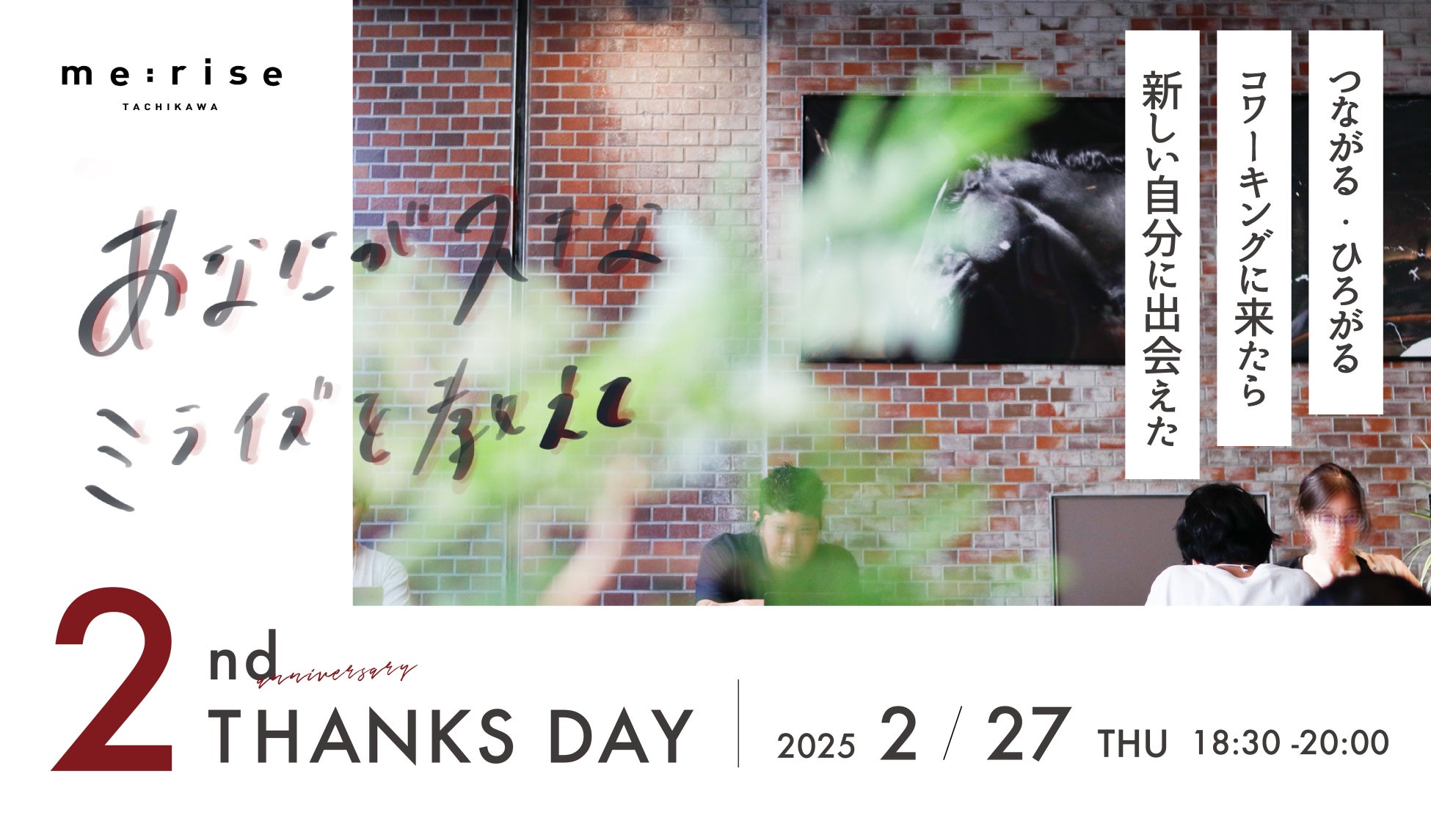 株式会社AGORA(読み:アゴラ、本社:東京都町田市、代表:長谷部 信樹)が多摩信用金庫より委託を受け運営する、コワーキングスペース&インキュベーションオフィスme:rise立川は、2025年2月1日で2周年を迎えました。2周年を記念したイベント「2ndアニバーサリーTHANKS DAY」を2月27日(木)に開催いたします。