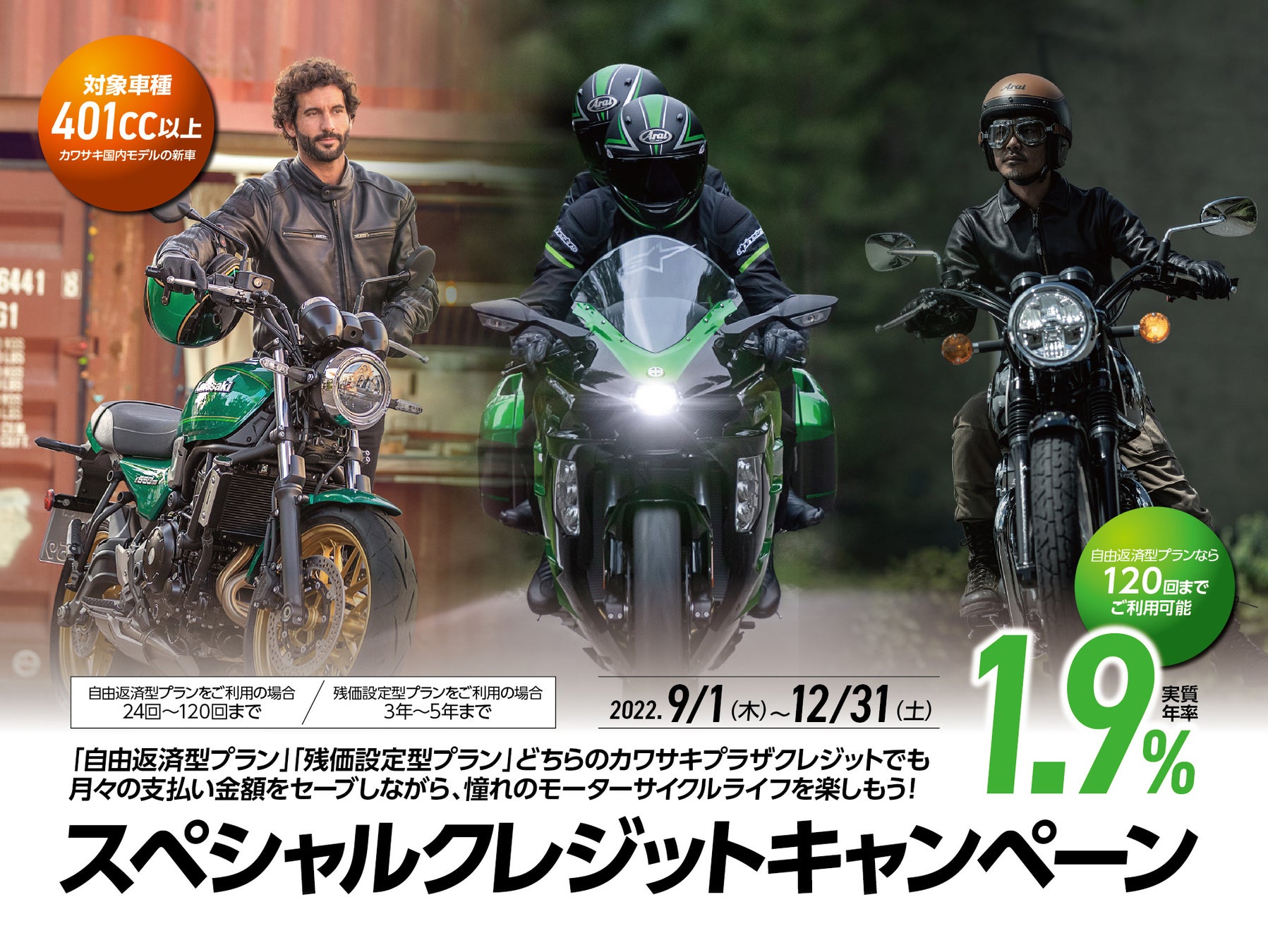 株式会社カワサキモータースジャパン(本社:兵庫県明石市、代表取締役社長:桐野 英子)が展開するカワサキ プラザネットワークでは、2022年9月1日(木)~2022年12月31日(土)までの期間中、カワサキプラザで対象の401㏄以上モーターサイクル新車をご購入時に実質年利1.9%でご利用いただける「カワサキプラザ スペシャルクレジットキャンペーン2022」を開催いたします。