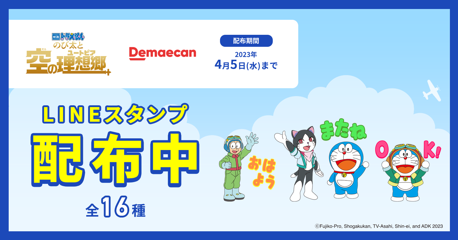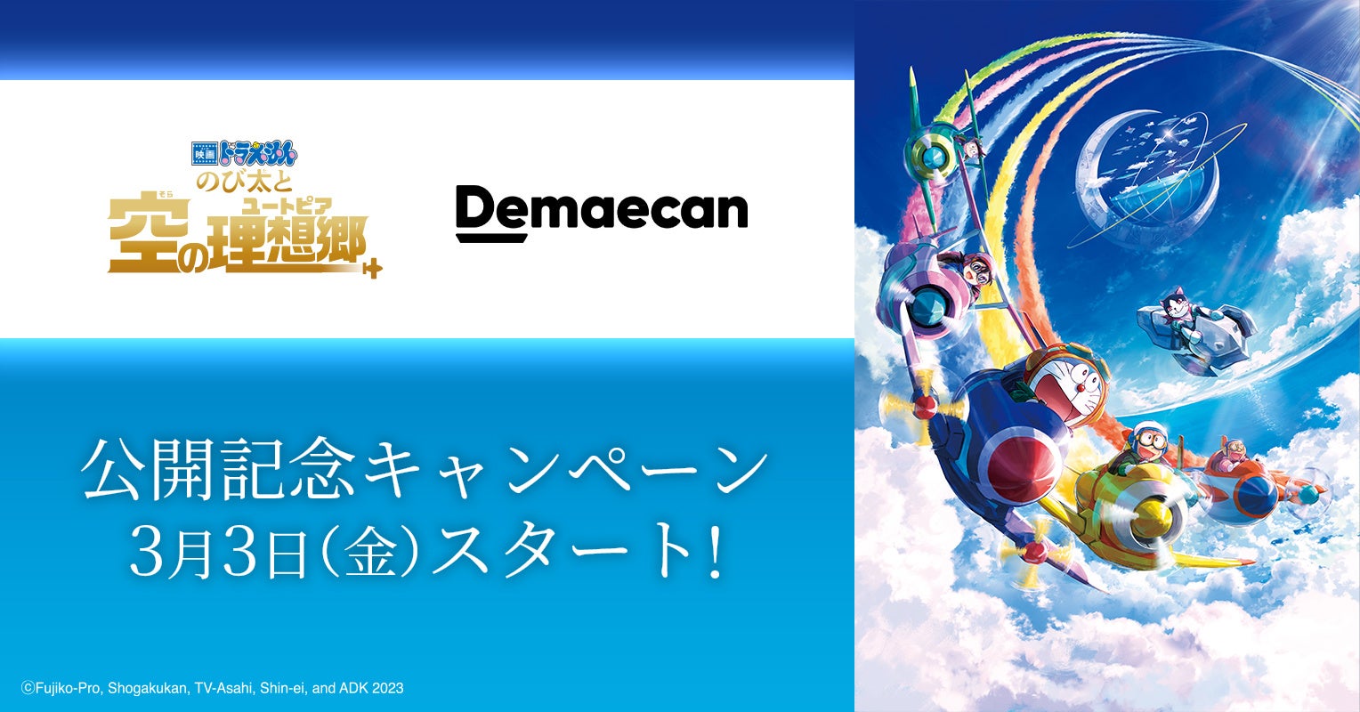 大人気テレビアニメ「ドラえもん」の劇場公開版である「映画ドラえもん のび太と空の理想郷(ユートピア)」は、映画公開日当日の2023年3月3日(金)より、公開記念キャンペーンを実施いたします。本キャンペーンでは、抽選で100名さまに「オリジナルアクリルスタンド(6種)セット」があたるエントリー&注文キャンペーンや、描き下ろしLINEスタンプの無料配布を実施いたします。なお、それぞれ実施日が異なるので、詳細は各キャンペーンページをご確認ください。