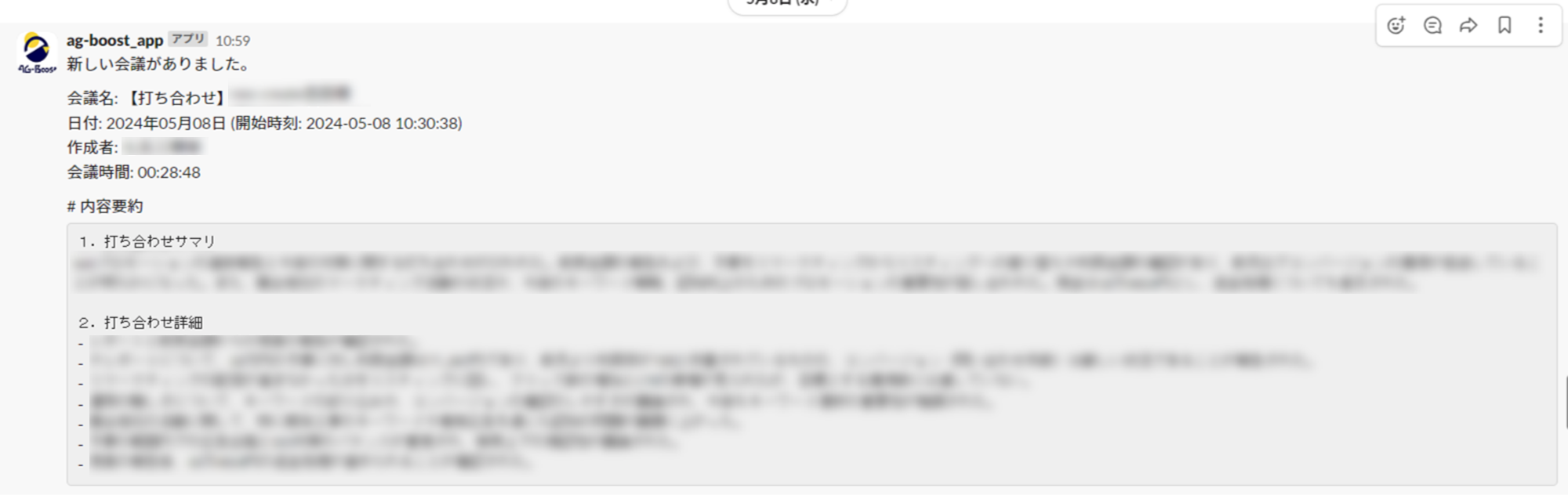 ミーティングの書き起こしと議事録が1分前後で出力され、任意のSlackチャンネル・DMに自動送付されます。顧客送付用の議事録としての利用のほか、社内へのミーティング概要共有としての活用も可能です。