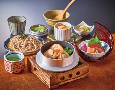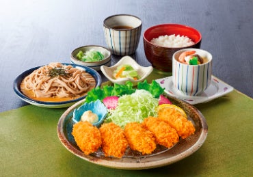 サガミ自慢のおろしそば・広島県産“大粒かきフライ”・お刺身・天ぷら・茶碗蒸し・小鉢・小ごはん・漬物・デザートがついた彩豊かな御膳。食べ応えも抜群です。