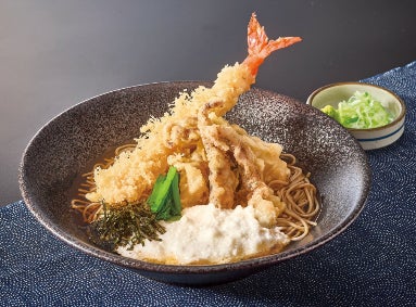 サガミ自慢のそばに、揚げたての大海老といかゲソの天ぷらをのせました。天ぷらのサクサク食感と、まろやかなとろろが絶妙に絡み合い、一口ごとに海の旨みとそばの風味を楽しめます。