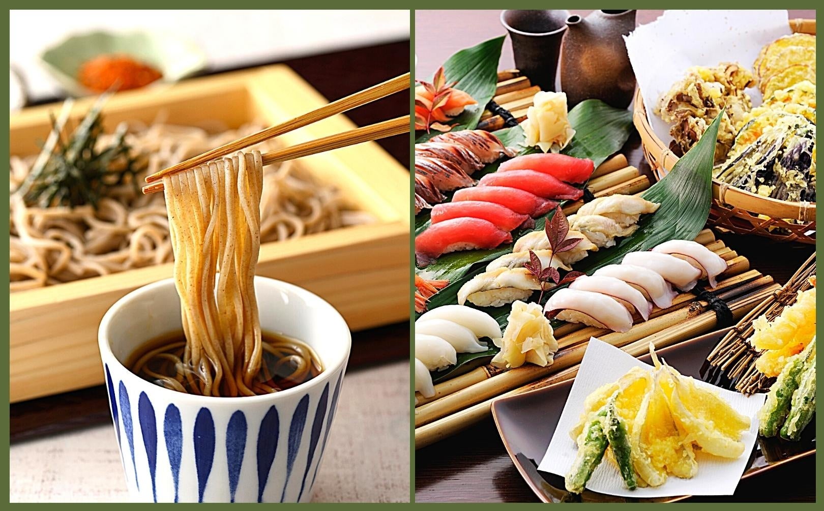 また、【かえし】と【だし】から毎日丁寧に作り上げ、香りとコクが際立つ自慢のそばつゆとともに、お召し上がりいただく、茹でたての風味豊かな「生そば」や、人気のネタを取り揃えた「握り寿司」、熱々揚げたての「天ぷら」など、和の人気ラインアップが勢ぞろい!