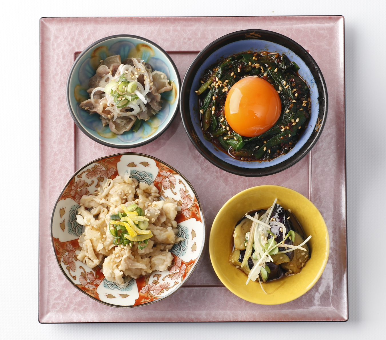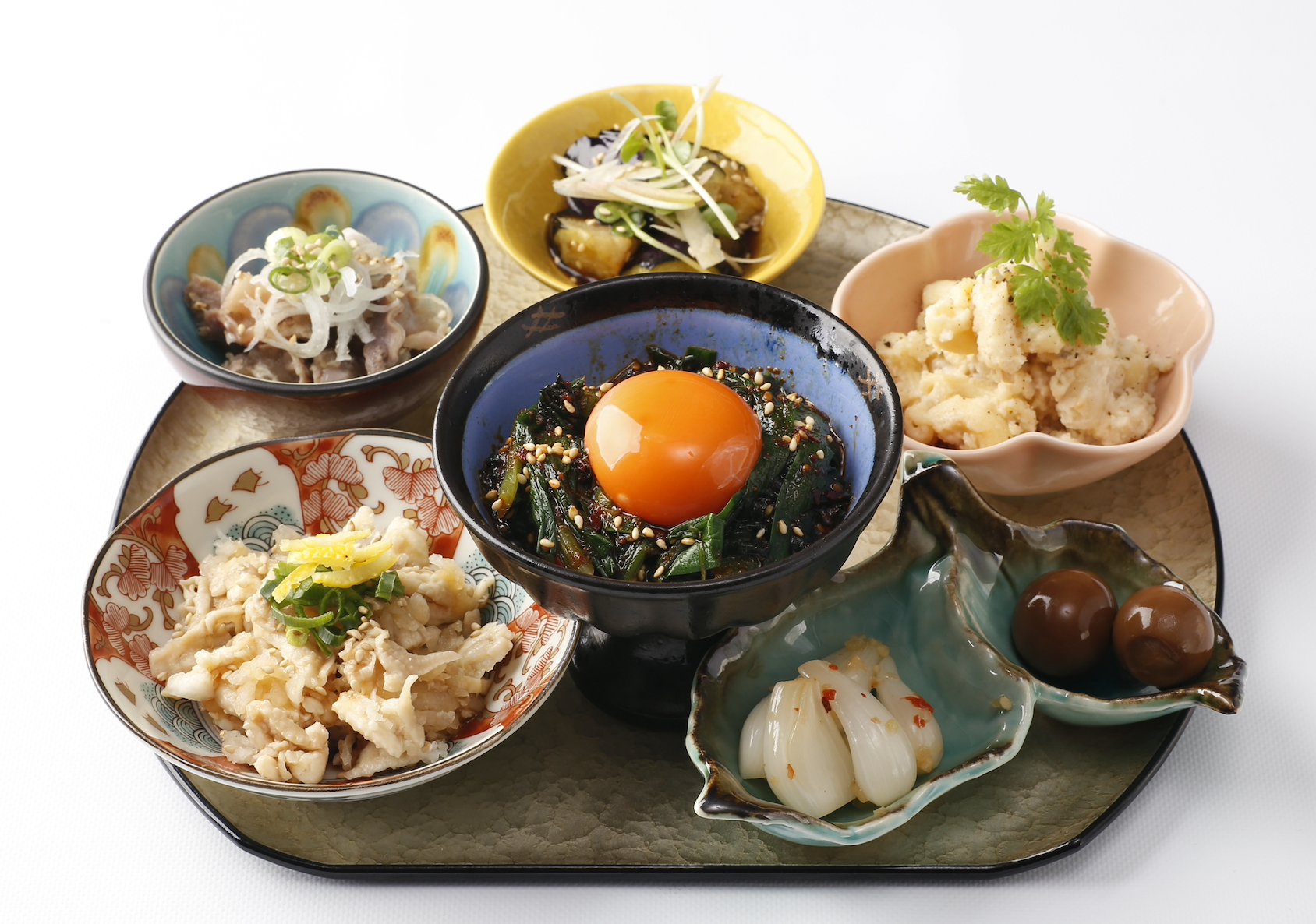 ニラの香りとほうれん草を自家製のソースで絡めピリ辛仕立てにしたにら玉ホーレンやとり皮ポン酢、ねぎ塩ダレのコリコリ砂肝など、お食事にもおつまみにもぴったりなおばんざいの贅沢な盛り合わせです。単品でもご用意がございます。