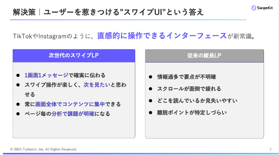 当社はそれらの解決策として、直感的な操作体験を提供する「スワイプ型LP」に注目しています。
