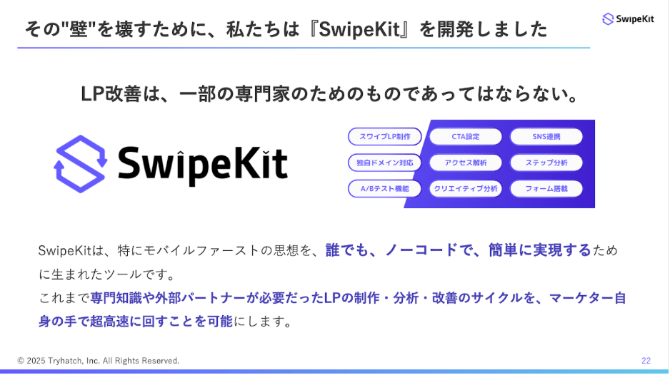 「SwipeKit」は、スワイプ型LPをノーコードで制作・分析・改善できるプラットフォームです。改善サイクルの短縮を支援し、マーケティング成果の最大化に貢献します。