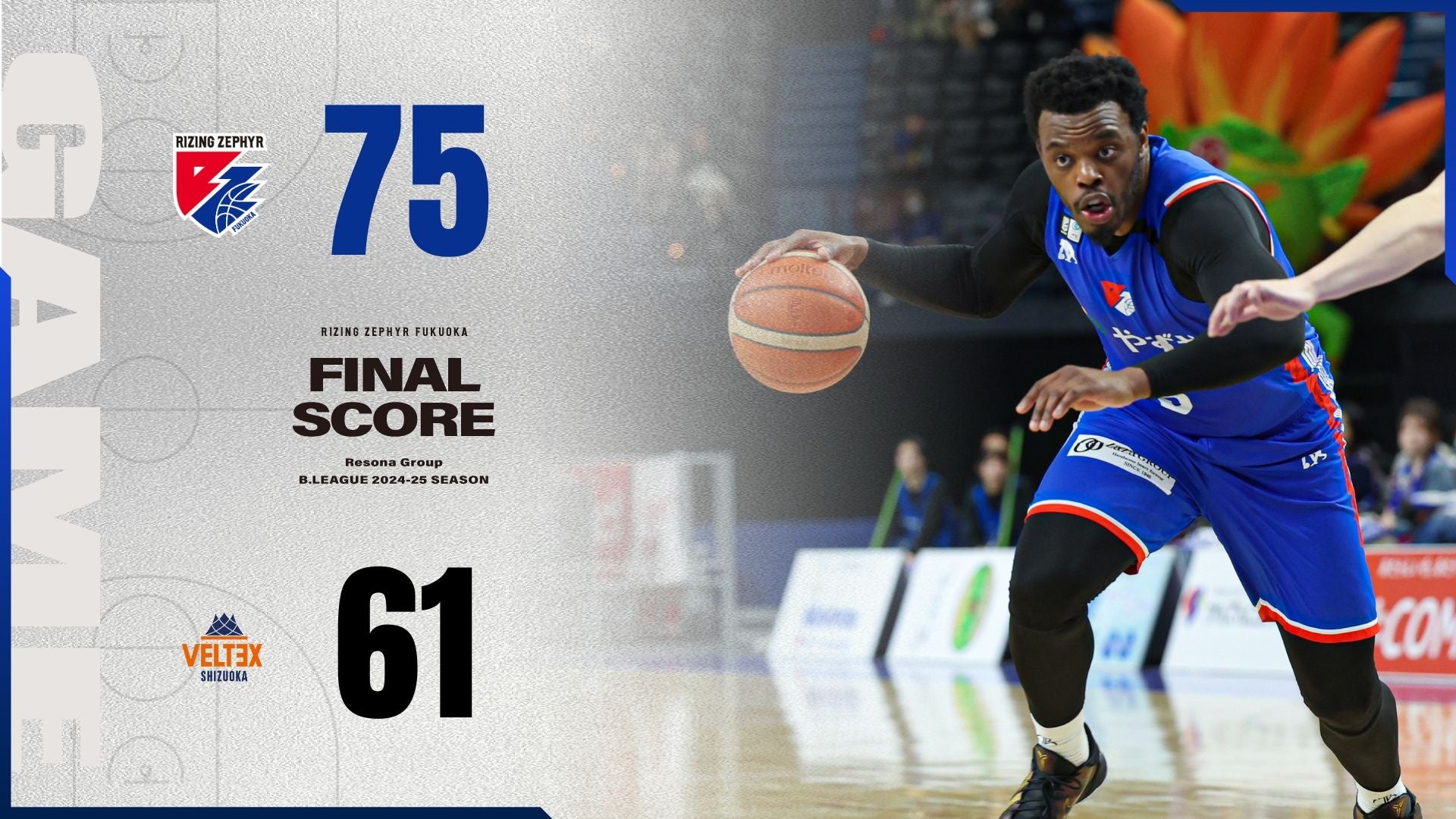 2025年4月12日(土)に開催した、りそなグループ B.LEAGUE 2024-25 シーズン【ライジングゼファーフクオカ vs.ベルテックス静岡】は、“福岡75-61静岡”で福岡の勝利となりました。